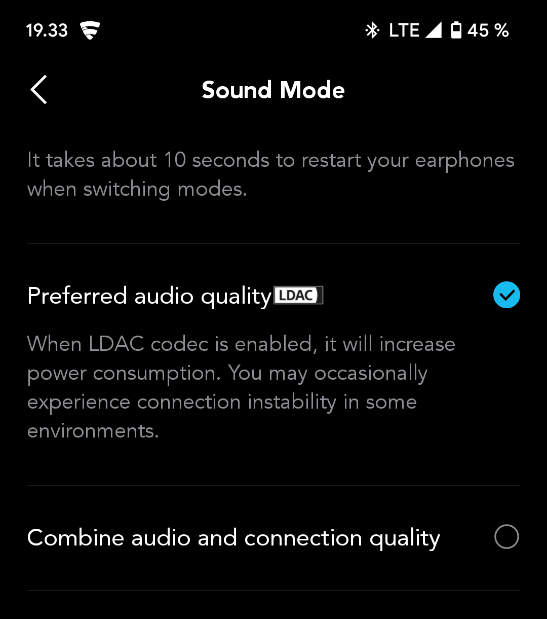 Oletusasetuksillaan Q45 toimii vain SBC- ja AAC-koodekeilla, sillä LDAC-vaihtoehto täytyy ladata ja asentaa erikseen Soundcore-puhelinsovelluksen kautta. Koodekki aktivoimalla menetetään tuki kahden laitteen samanaikaiselle paritukselle. Tämä pätee kuitenkin käsittääkseni kaikkiin muihinkin LDAC-koodekkia tukeviin kuulokkeisiin, kuten eri Sony-malleihin (Sony on itse kehittänyt koodekin).