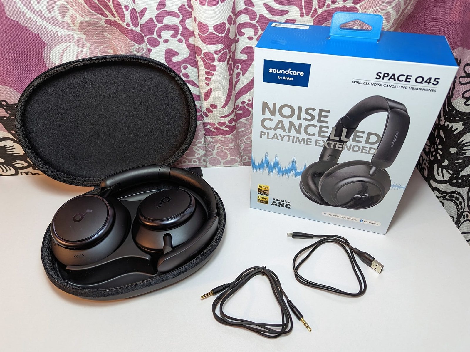 Space Q45 toimitetaan pahvilaatikossa, joka on selvästi suunniteltu myymälän hyllyyn asetettavaksi. Kuulokkeet on pakattu mukana tulevaan kovakuoriseen kuljetuskoteloon, joka on käytännöllisen kokoinen – esimerkiksi Sonyn XM4-kuulokkeiden kotelo on varsin samanlainen. Akun lataamista varten tarjotaan lyhyt USB-C -> USB-A -johto, ja koska kuulokkeita voidaan kuunnella kaapelilla, mukana on myös 3,5 mm:n AUX-kaapeli. Molemmat kaapelit ovat ohuita rimpuloita, jotka eivät tule pysymään koskaan suorana.