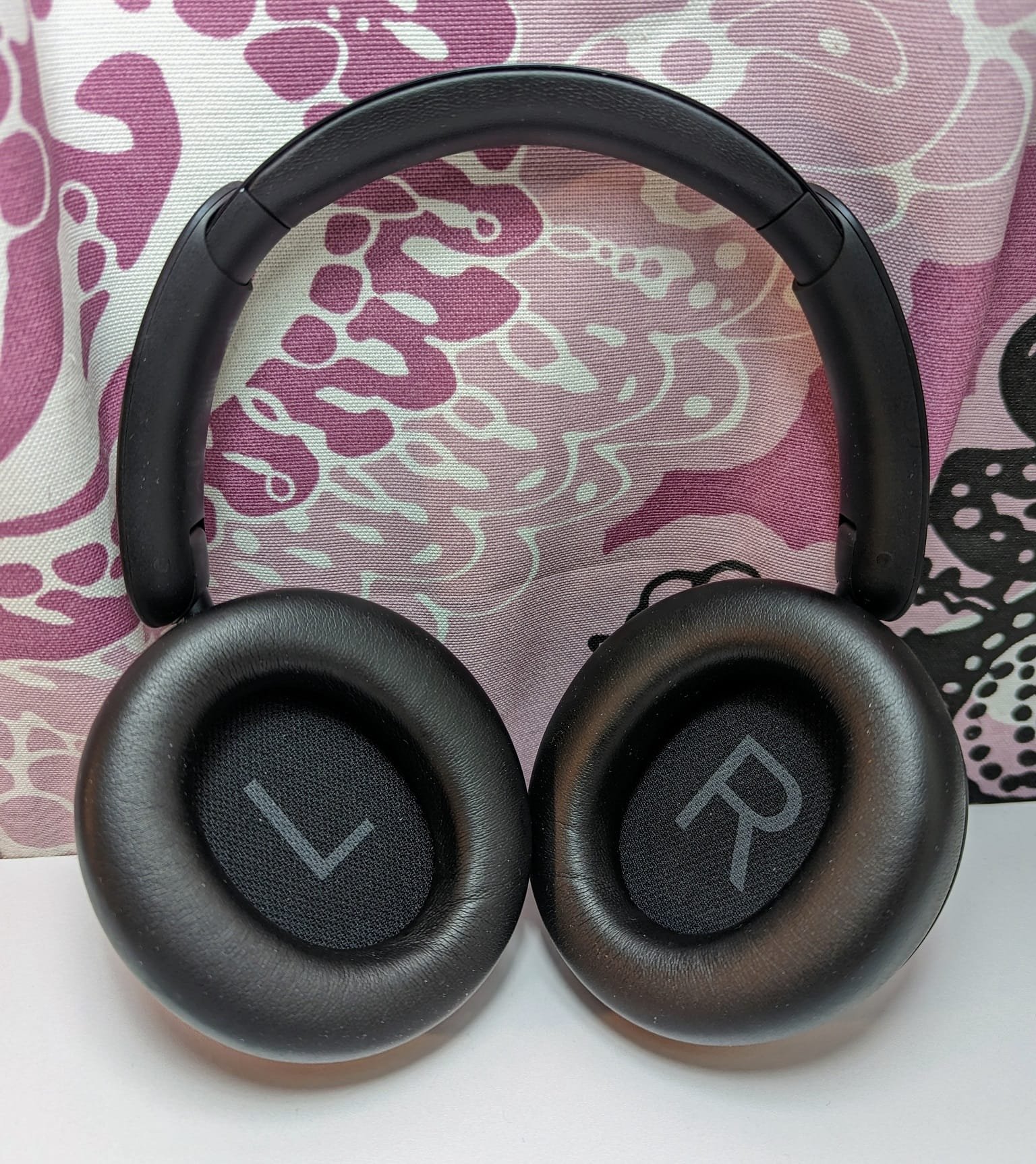 Muotonsa puolesta Q45:n pehmusteet ovat hyvät, sillä omat hieman suuremmat korvani mahtuvat niiden sisään helposti. Korva-aukko on 65 mm korkea ja 45 mm leveä, ja syvyyttä on noin 23 mm. Vertailun vuoksi syvyyttä on Q30-mallissa pari milliä vähemmän, ja Valcon VMK20:ssä noin sentti vähemmän. Q45 sopiikin syvine pehmusteineen erinomaisesti niille, jotka eivät pidä siitä, että pehmusteen pohjakangas painautuu on-ear-tyylisesti korvanlehtiä vasten.