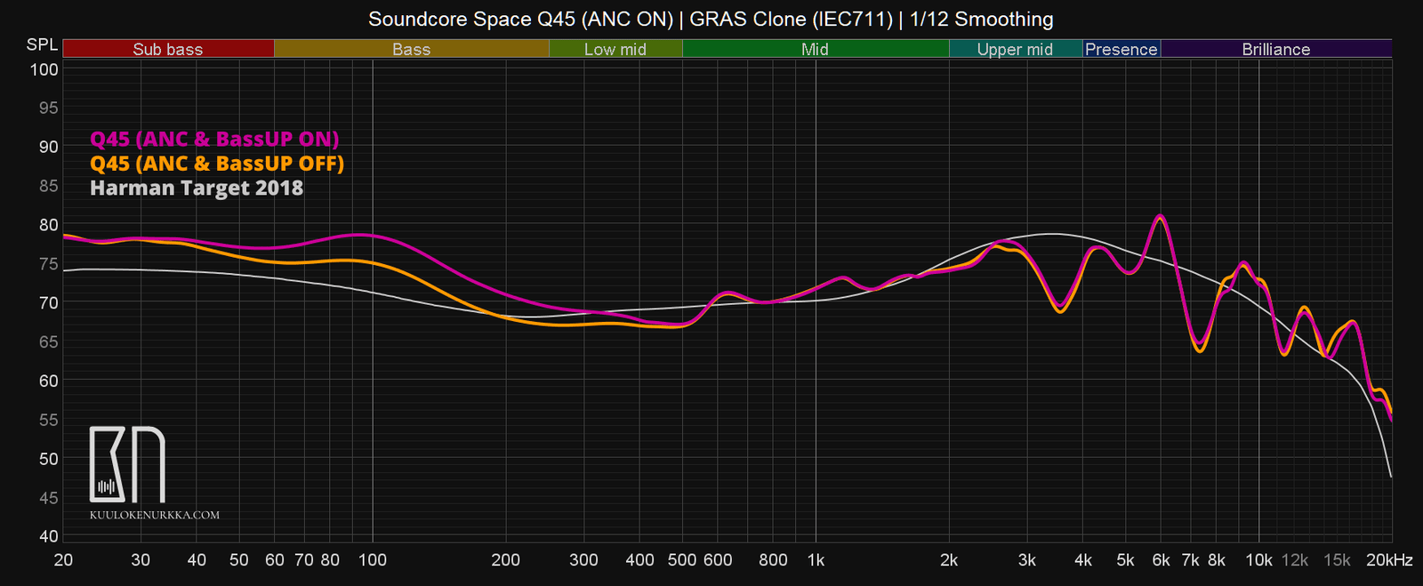 Valmistaja kuvailee Q45:n basson olevan jyskyttävää ja ylätaajuuksien kirkkaat. Tämä pitääkin täysin paikkansa, sillä ylempien bassotaajuuksien murina ja pörinä peittää alleen kaiken muun paitsi pistävän ja terävän kuuloiset ylätaajuudet. Kuulokkeet kuulostavat oletuksena siltä, kuin musiikin edessä olisi paksu patja. Basson kumina on niin järkyttävää, että ääni menee siitä täysin tukkoon. Kuuntelukelvoton lopputulos johtuu kuitenkin ”onneksi” valmistajan erillisestä BassUP-nimisestä lisäasetuksesta, joka on oletuksena päällä (punertava jana yllä näkyvässä taajuusvastekuvaajassa). Kun se otetaan pois päältä puhelinsovelluksen kautta, tilanne kohenee huomattavasti (oranssi jana kuvaajassa).