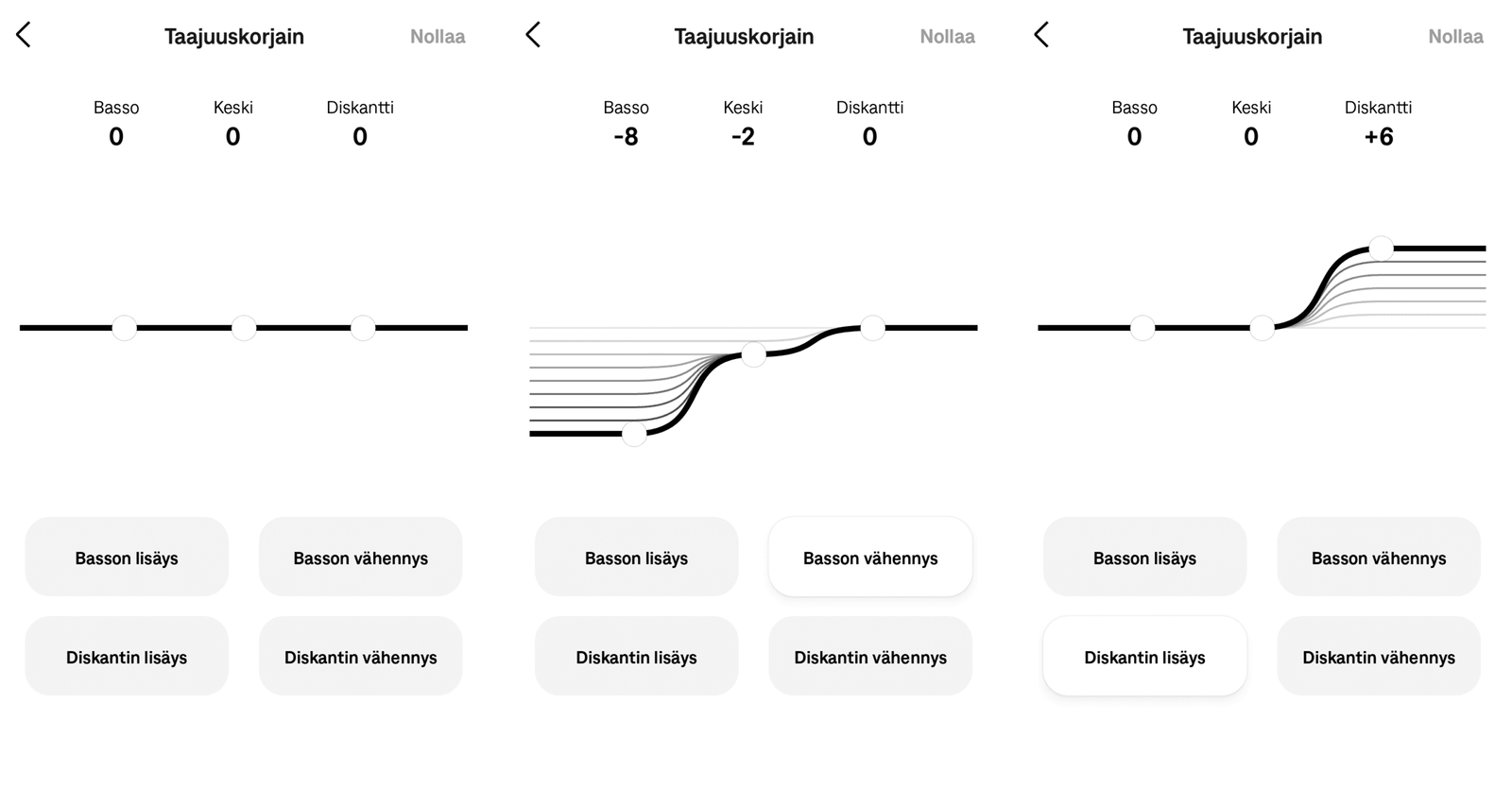 Itse jään kaipaamaan vielä sitä, että jokaiselle tilalle voitaisiin määrittää erillinen taajuuskorjaus. Esimerkiksi meluisammassa ympäristössä saattaisin kaivata enemmän bassoa kuin sisätiloissa. Tällainen äänen räätälöinti ei kuitenkaan harmillisesti ole mahdollista, vaan käyttäjän on tultava toimeen yhdellä ja samalla taajuuskorjauksella – jos siis ominaisuutta hyödynnetään. Sovelluksen 3-kanavainen taajuuskorjain on melkeinpä liiankin yksinkertainen, mutta Bose selvästi ymmärtää, miten useimmat haluaisivat sen kuulokkeita säätää, ja mikä olisi ylipäätään taajuusvasteen näkökulmasta optimaalisinta. Täten esimerkiksi basson määrää saadaan muutettua juuri ihanteellisesti hyllytyyppisellä filtterillä. Jokainen kolmesta liukusäätimestä liikkuu enintään 10 pykälää ylös- tai alaspäin, mutta desibeleissä mitattuna maksimaalinen muutos on lähempänä viittä kuin kymmentä desibeliä. Vaihtoehtoisesti tarjolla on myös muutama valmis ääniprofiili, jotka siirtävät säätimet tiettyyn asentoon.