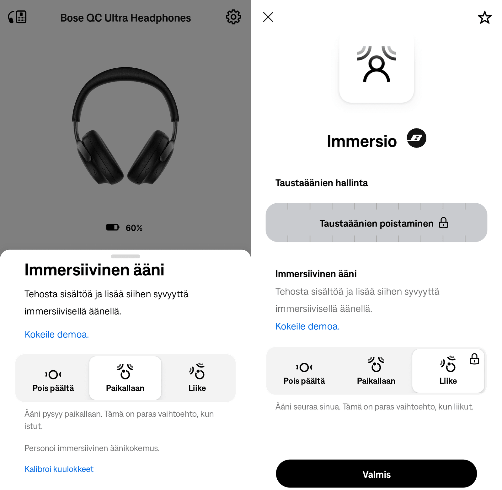 Olen tähän mennessä pitänyt tällaista tilaääntä turhana kuriositeettina, mutta Bose onnistuu jopa tekemään minuun pienen vaikutuksen. Ääni siirtyy kirjaimellisesti etupuolelleni, eikä taajuusvastekaan vääristy aivan pilalle moniin muihin kuulokkeisiin verrattuna. Kyllä musiikki edelleen paremmalta kuulostaa ilman tilaääntä, mutta kriittinen vertailu unohtaessa ominaisuus tarjoaa silloin tällöin käytettynä hauskan kokemuksen. Parhaimmillaan tunnelma muistuttaa hieman livekeikkaa kauempaa kuunneltuna. Jos joku siis pitää tällaisesta, QuietComfort Ultran tilaääni on mielestäni toteutettu poikkeuksellisen onnistuneesti. Tähän vaikuttaa varmasti myös se, etteivät Bosen kuulokkeet kuulosta lähtötilanteessa yhtä epäluonnollisilta ja vääristyneiltä kuin vaikkapa Sonos Ace.