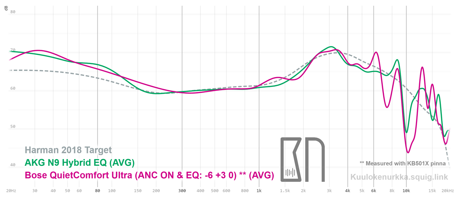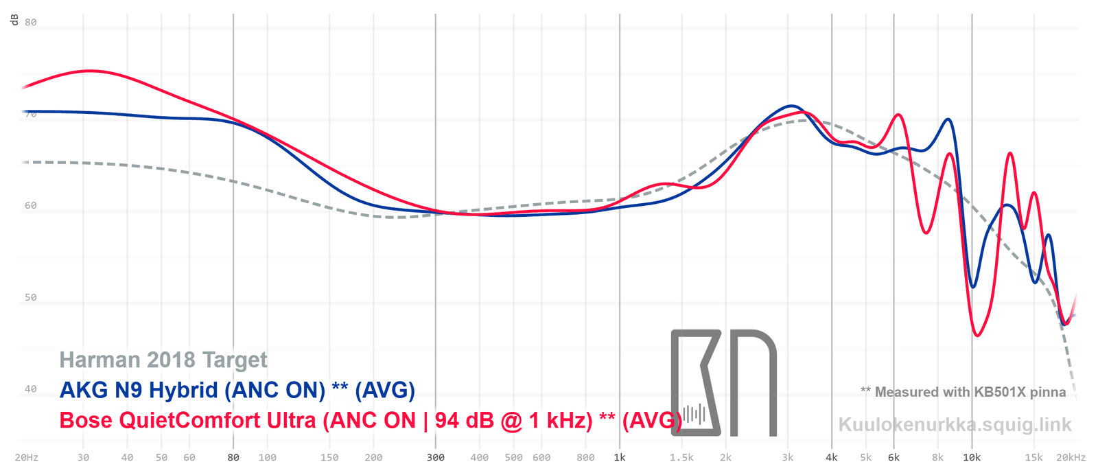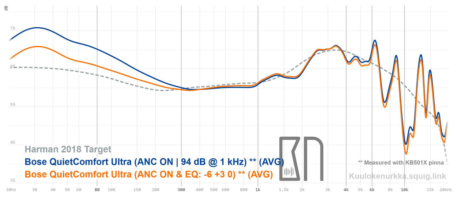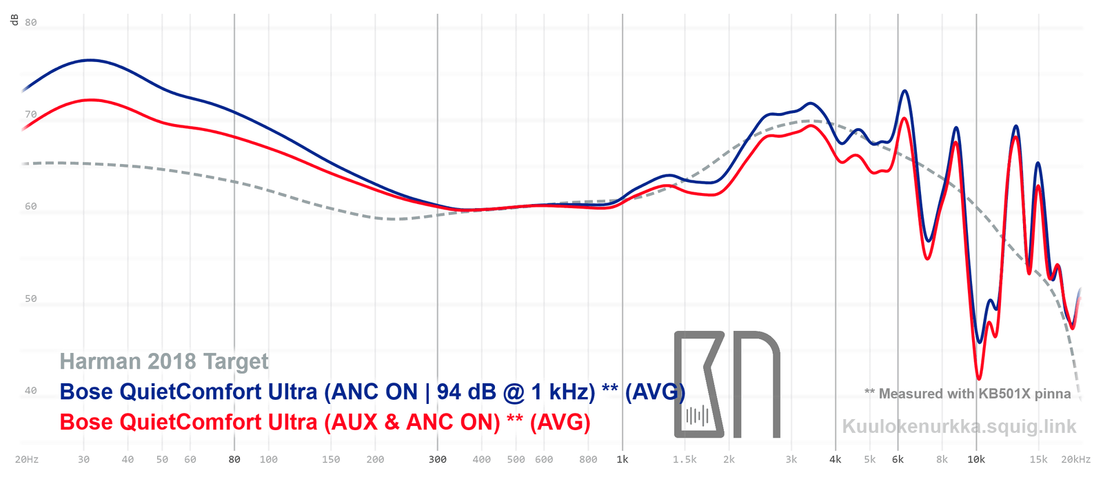 Kuulokkeiden taajuusvastemittaukset on tehty IEC711-standardin mukaisella laitteistolla ja KB501X-mallisilla silikonikorvilla. Kuvaajissa käytetään vertailupohjana tieteelliseen tutkimukseen pohjautuvaa Harmanin tavoitekäyrää (vuoden 2018 versio), joka on yleistys siitä, millaisen taajuusvasteen mukainen ääni kuulostaisi suurimman osan mielestä hyvältä ja vastaisi tasapainoisia kaiuttimia hyvin akustoidussa huoneessa. Lisätietoa mittauksista ja niiden tarkkuudesta löytyy Taajuusvastemittaukset-sivulta. QuietComfort Ultran taajuusvaste on myös vertailtavissa muiden mitattujen kuulokkeiden kanssa Squiglink-vertailutyökalun avulla.
