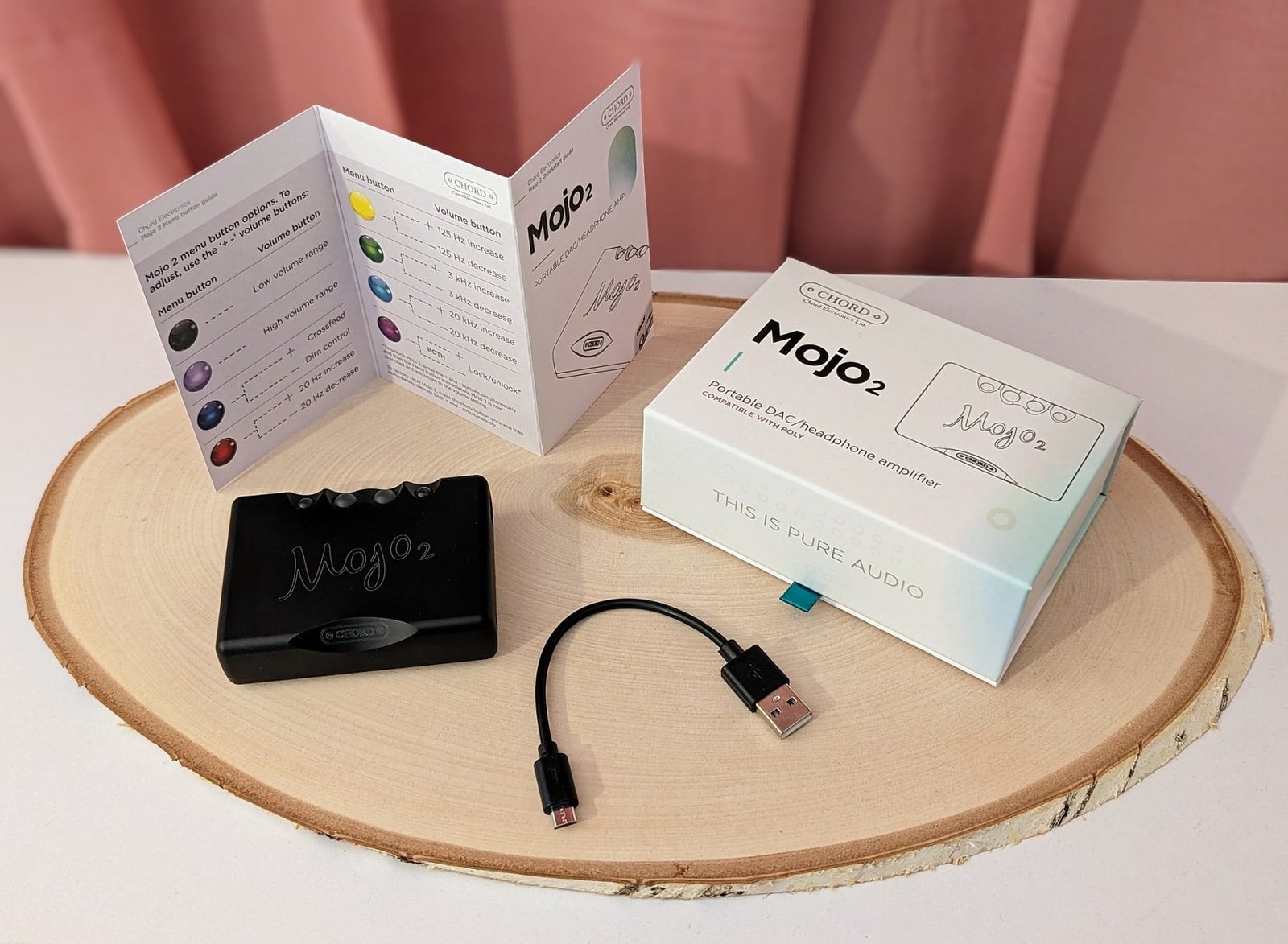 Mojo 2:n laajempi käyttöopas löytyy valmistajan verkkosivuilta ja modernimpaan USB-C-tuloliittimeen täytyy hankkia kaapeli erikseen – muutaman euron säästö valmistajalle ja suurempi lisäkulu laitteen ostajalle. Minkäänlaista säilytyspussukkaa Chord ei myöskään Mojo 2:lle toimita, mutta laitteelle on ostettavissa erikseen 90 euron hintainen nahkakotelo. Niukan varustelun myötä myyntipakkaus on sentään saatu pidettyä näppärän kokoisena.