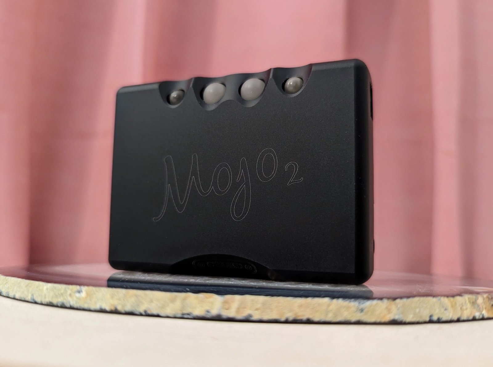 Mojo 2 ei edeltäjänsä tapaan lukeudu kooltaan kaikkein pienimpiin mobiilivahvistimiin, eikä sen 185 gramman painokaan ole kevyimmästä päästä. Positiivisena puolena laitteen metallirunko on kuitenkin todella jämäkkä ja laadukas. Mukana kuljettaminenkaan ei lopulta ole hankalaa, sillä Mojo 2 mahtuisi edelleen helposti esimerkiksi taskuun. Hieman tavallista suurempi paino muuttuu eduksi, mikäli laitteen on tarkoitus korvata jokin suurempi työpöytälaite. Esimerkiksi Qudelix 5K ja monet dongle-laitteet, kuten iFi Go Link, ovat mielestäni liian pieniä ja kevyitä pysyvästi pöydällä pidettäviksi, sillä ne eivät pysy kunnolla paikoillaan. Mojo 2:n sen sijaan näkisin eräänlaisena välimuotona työpöytä- ja mobiililaitteista. Sen pohjaan on myös asennettu sopivan tahmeat kumijalat.