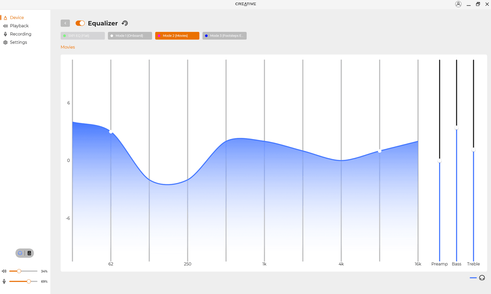 Creativen taajuuskorjaimen etuna on sen helppokäyttöisyys verrattuna esimerkiksi mainitsemaani Equalizer APO -ohjelmistoon. Asetukset tallentuvat laitteeseen, minkä jälkeen niitä voidaan valita ja aktivoida helposti näppäinten avulla. Oletusääniprofiileina laitteessa on tarjolla asetukset musiikille, elokuville ja askelten kuunteluun peleissä. Halutessani voisin muokata elokuville tarkoitettua asetusta sopivaksi esimerkiksi Hifiman Sundaralle ja askelille tarkoitettua asetusta Sennheiser HD600:lle. Kun vaihtaisin kuulokkeita, voisin vaihtaa EQ-profiilia lennosta sopivaa näppäintä painamalla. Parasta Creativen taajuuskorjaimessa on kuitenkin se, että asetukset todellakin säilyvät laitteen sisäisessä muistissa, jolloin sovellusta ei tarvitse olla asennettuna kuuntelulaitteessa. Tallentamani asetukset ovat käytettävissä, kun kytken Sound Blaster X4:n esimerkiksi pelikonsoliin.