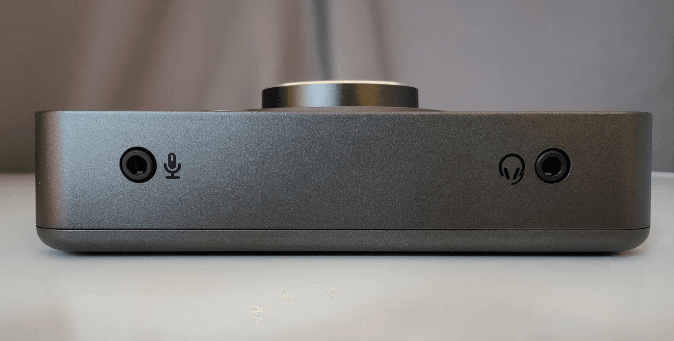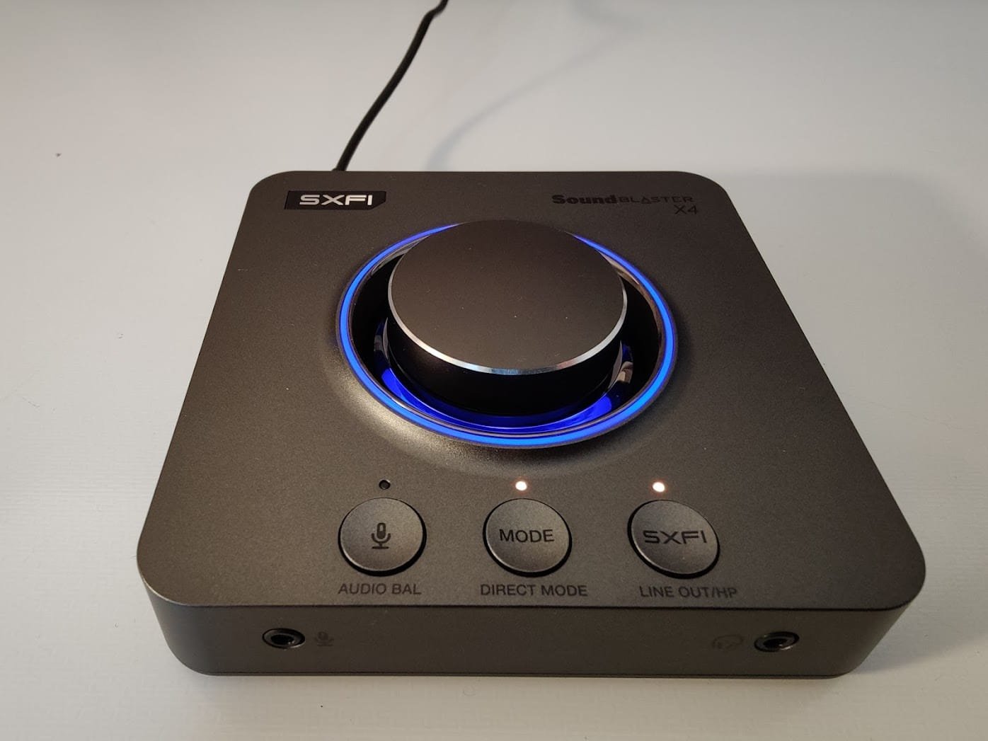 Liitännöiltään Sound Blaster X4 on kunkin tarpeista riippuen joko monipuolinen tai vaillinainen. Etupaneelissa on yksi 3,5 mm:n liitäntä kuulokkeille ja toinen mikrofonia varten. Laitteen ensisijaista kohderyhmää ajatellen valittu kuulokeliitin käy järkeen, mutta jäin itse kaipaamaan 6,35 mm:n liitintä. Balansoituja liitäntöjä ei edullinen myyntihinta huomioiden voi oikein vaatiakaan. Kuulokkeet laitteeseen kiinnittäessä esiintyy aina pientä särinää, mutten kuitenkaan ole havainnut häiriöääniä käytön aikana. Mikrofoniliitännän toimivuutta en testannut.