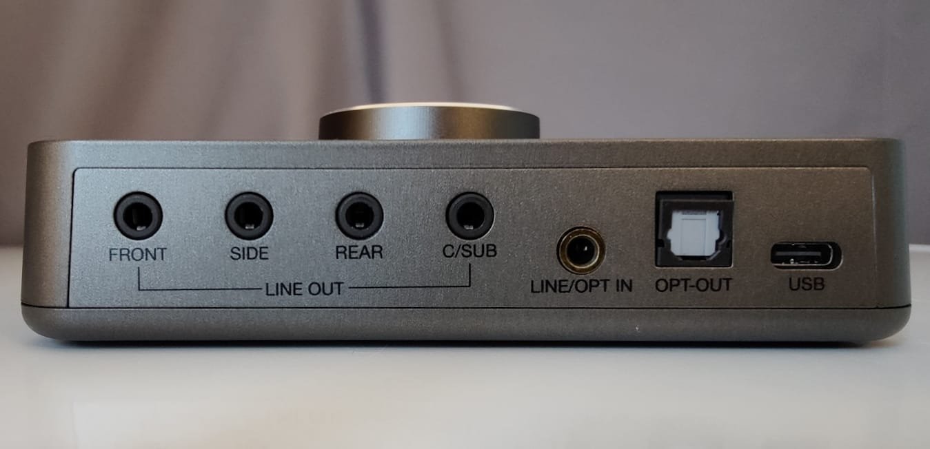Laitteen takapaneelista löytyy neljä 3,5 mm:n liitäntää kaiuttimille ja subwooferille. Koska käytän yksinomaan kuulokkeita, liittimet jäävät itselleni tarpeettomiksi. Monikanavaisen kaiutinjärjestelmän omistajille ne tuovat kuitenkin lisäarvoa, kun Sound Blaster X4:ää verrataan tavanomaisempiin kuulokkeille suunniteltuihin yhdistelmälaitteisiin.
