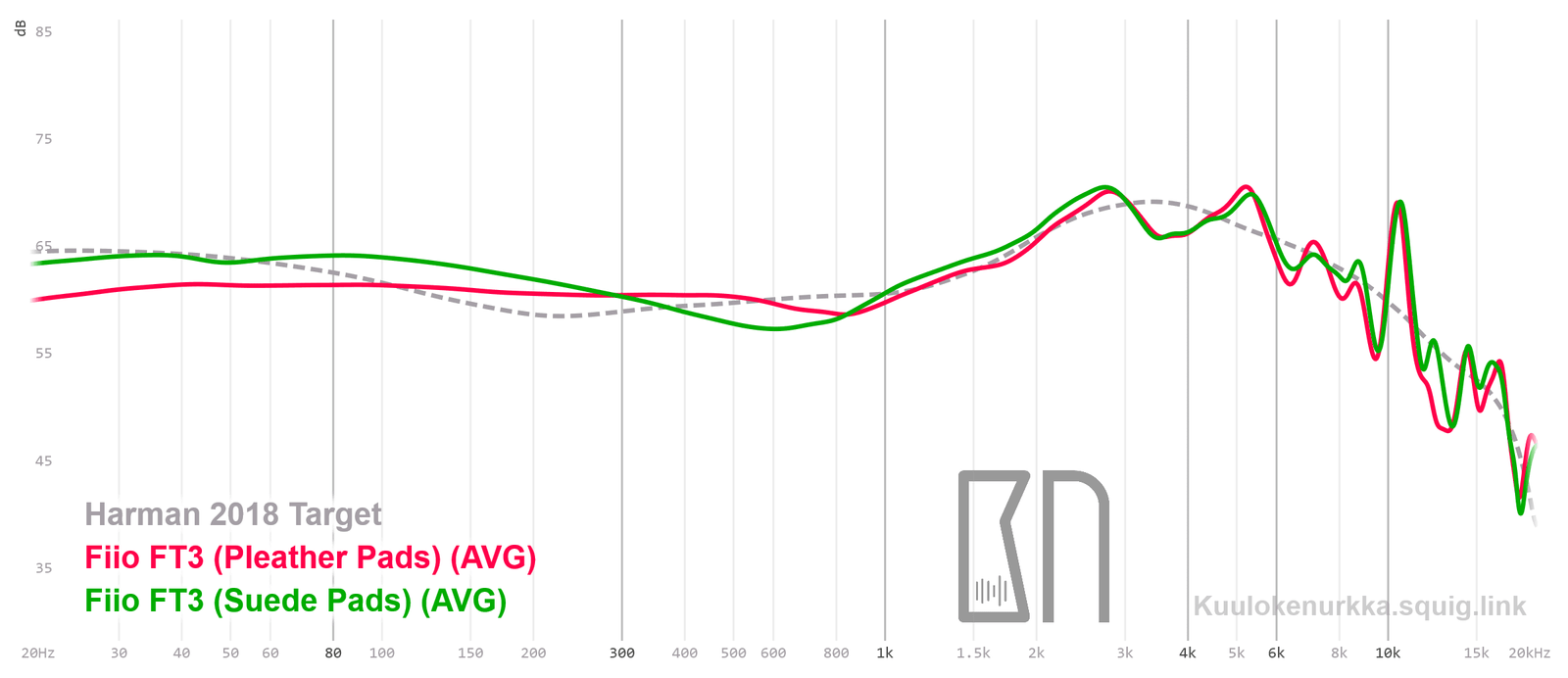 FiiO FT3:n taajuusvaste suhteessa Harmanin tavoitekäyrään vuodelta 2018. Mittaukset on tehty IEC711-standardin mukaisella laitteistolla useiden mittauskertojen ja kahden kanavan keskiarvona. Punainen jana kuvaa ääntä keinonahkapehmusteilla ja vihreä mokkapehmusteilla.