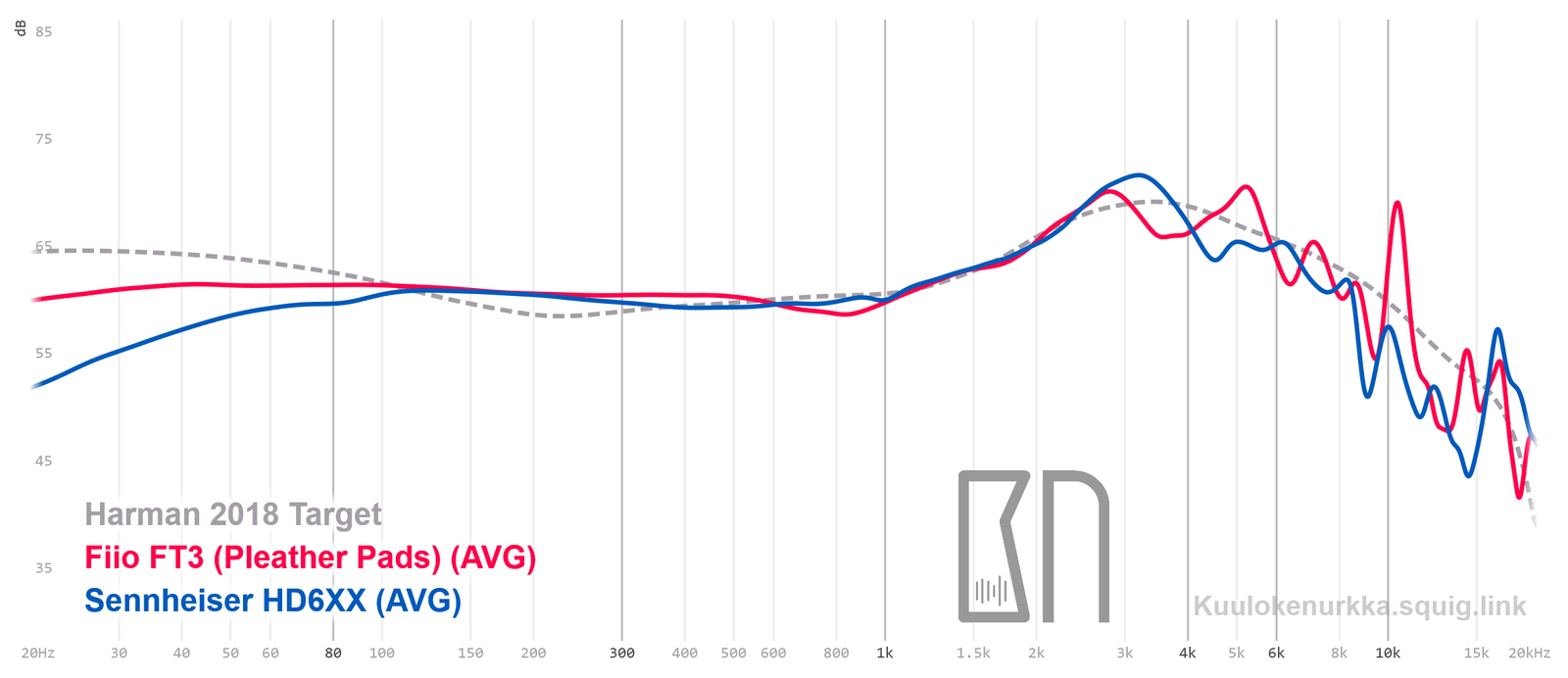 FiiO FT3:n (punainen) ja Sennheiser HD6XX:n (sininen) taajuusvasteet suhteessa Harmanin tavoitekäyrään vuodelta 2018. Mittaukset on tehty IEC711-standardin mukaisella laitteistolla useiden mittauskertojen ja kahden kanavan keskiarvona.