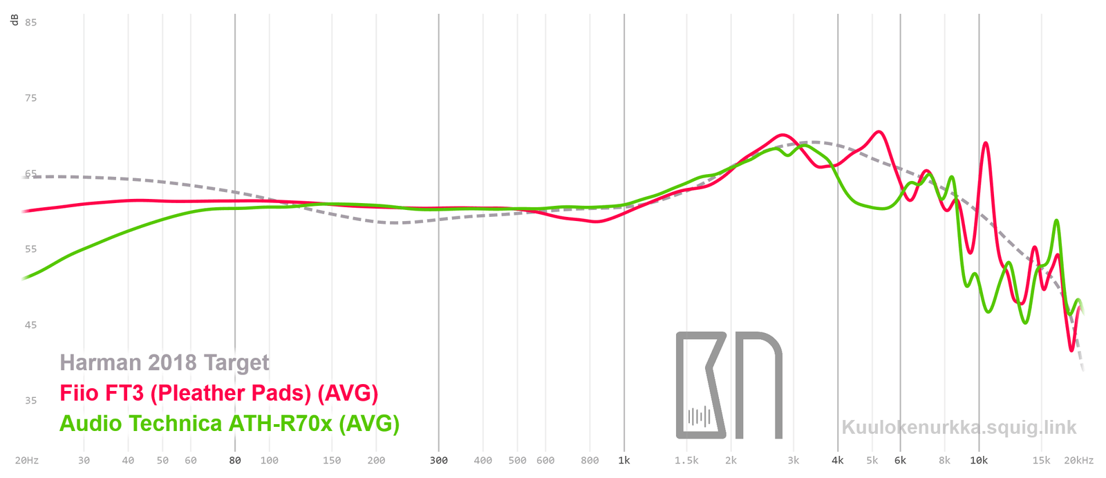 Audio-Technican ATH-R70x on taajuusvasteeltaan melko samankaltainen kuin FiiO:n FT3. Selkeimmiksi eroiksi muodostuu FT3:n voimakkaampi alabasso ja R70x:n aavistuksen vetäytynyt 4–6 kHz:n taajuusalue eli niin sanottu preesensalue. Jälkimmäisen vuoksi R70x kuulostaa omituisen nasaalilta ja verhoutuneelta. FT3:n korostuneempi diskantti tekee siitä raikkaamman, kun taas R70x on rauhallisempi. Pidän itse R70x:n hillitympää esitystapaa luonnollisempana.