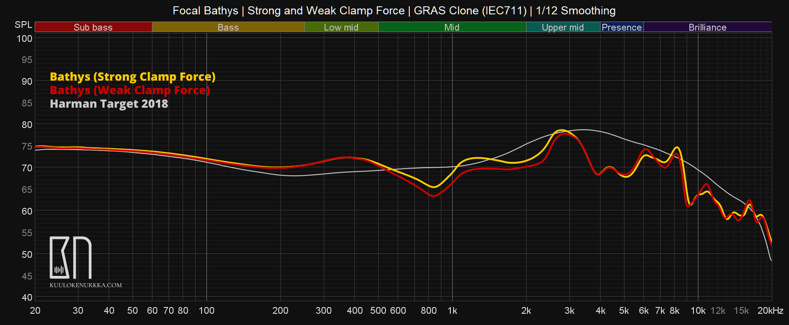 Focal Bathysin taajuusvaste kahdella erilaisella sangan puristusvoimalla suhteessa Harmanin tavoitekäyrään vuodelta 2018. Mittaukset on tehty IEC711-standardin mukaisella laitteistolla useiden mittauskertojen ja kahden kanavan keskiarvona.