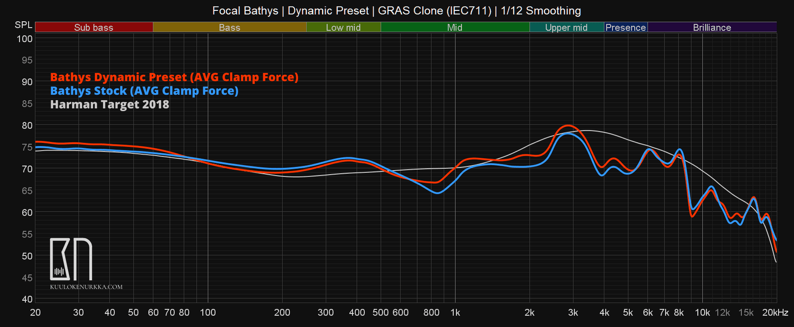 Focalin maininta Harmanin tavoitekäyrän tyylisestä äänestä pitää paikkansa, sillä keskitaajuuksiin tulee kauttaaltaan lisää energiaa (tätä olisi mahdotonta saavuttaa manuaalisella taajuuskorjauksella). Myös alabassoa on lisätty hieman, kun taas ylemmiltä bassotaajuuksilta on otettu hieman pois, jolloin alataajuudet toistuvat aiempaa selkeämmin. Lopputulos on lähtötilanteeseen verrattuna varsin neutraali ja raikas, mikä tekee Bathysista entistä monipuolisemman kuulokkeen. Jollekin musiikille saattaa sopia paremmin tuhdimpi ja rauhallisempi vakioääni, kun taas toisenlainen musiikki hyötyy Dynamic-tilan energisemmästä esitystavasta.