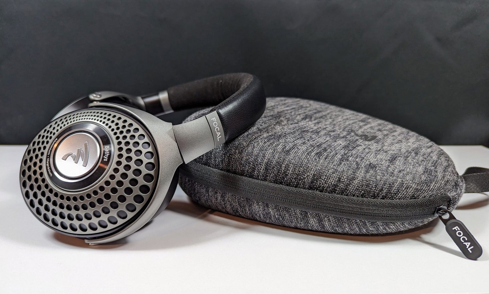 Kankaalla päällystetty kotelo muistuttaa ulkonäöltään suurempien Focal-mallien mukana tulevia koteloita. Pienempikokoisen Bathysin kupit kääntyvät vaakatasoon, joten kotelokin on riittävän kompakti mukana kuljettamisen näkökulmasta. Esimerkiksi Sony WH-1000XM5:n kotelo on melko vastaavan kokoinen. Focalin koteloon liittyy myös yksi lievästi ärsyttävä piirre: kuulokkeet täytyy aina pyöräyttää pakatessa 180 astetta ympäri, koska kupit kääntyvät vaakatasoon päinvastaiseen suuntaan koteloon nähden. Kuulokekupit sinällään taipuvat mielestäni oikeaan suuntaan, koska ne asettuvat mukavasti rintakehää vasten kuulokkeet korvilta kaulalle laskiessa.