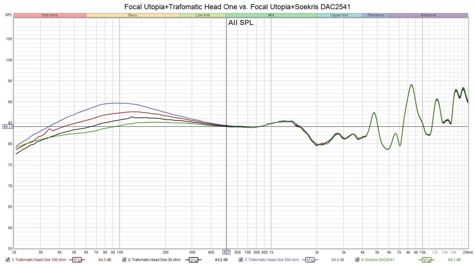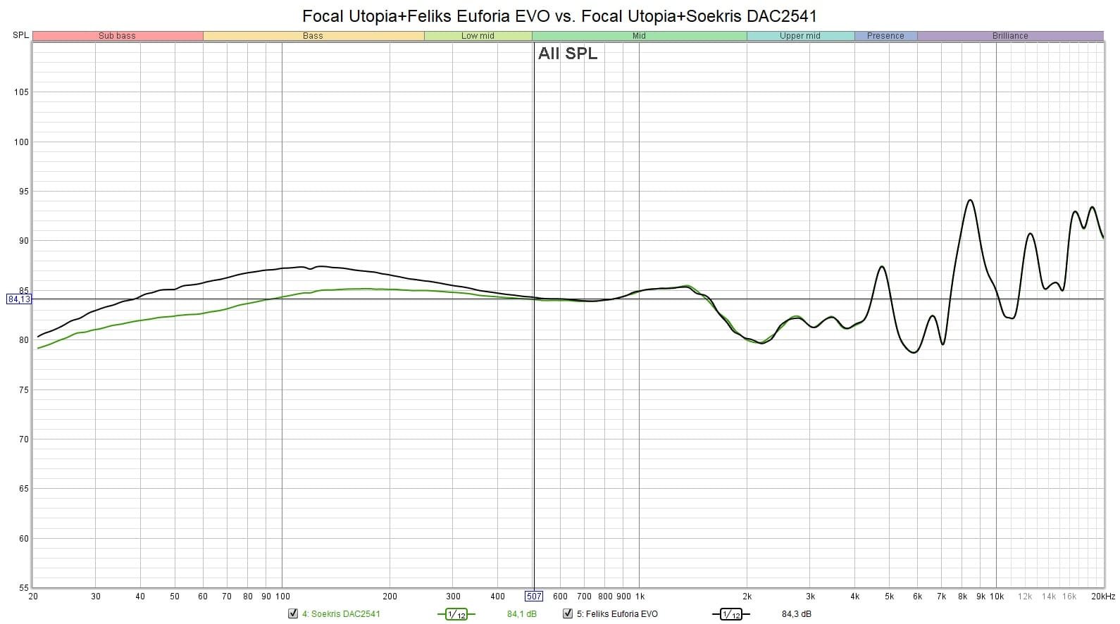 Euforia EVO voimistaa Utopian bassoa ja alimpia keskitaajuuksia (musta jana). Vihreä jana kuvaa kuulokkeiden taajuusvastetta matalan ulostuloimpedanssin vahvistimella mitattuna.