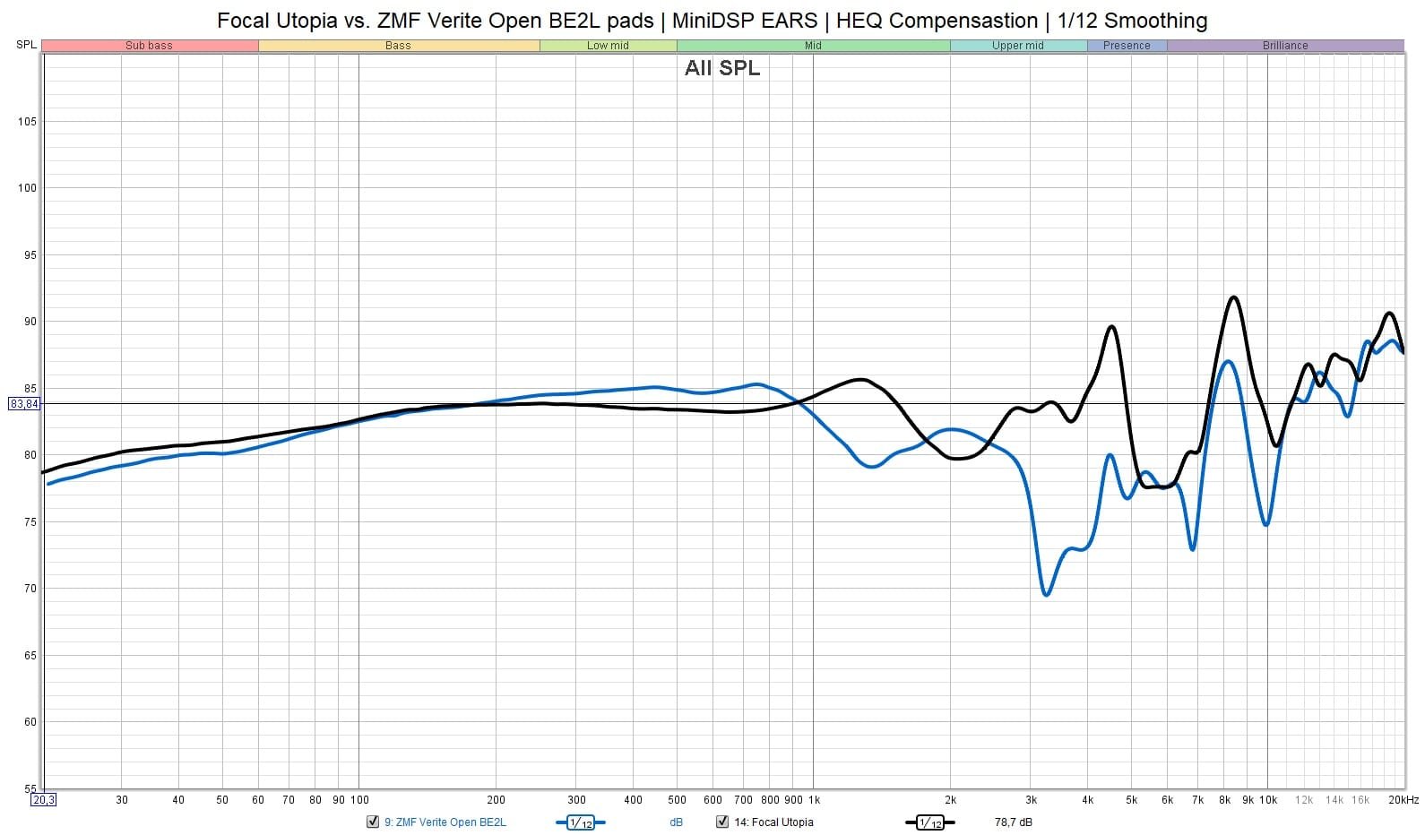 Utopian (musta) ja Veriten (sininen) taajuusvasteet MiniDSP EARS:illa mitattuna suhteessa HEQ-kompensaatioon. Veritessä oli kiinni BE2 -nahkapehmusteet. Tässäkin yhteydessä kannattaa huomioida mittauslaitteesta johtuva epätarkkuus Utopian ylätaajuuksissa.