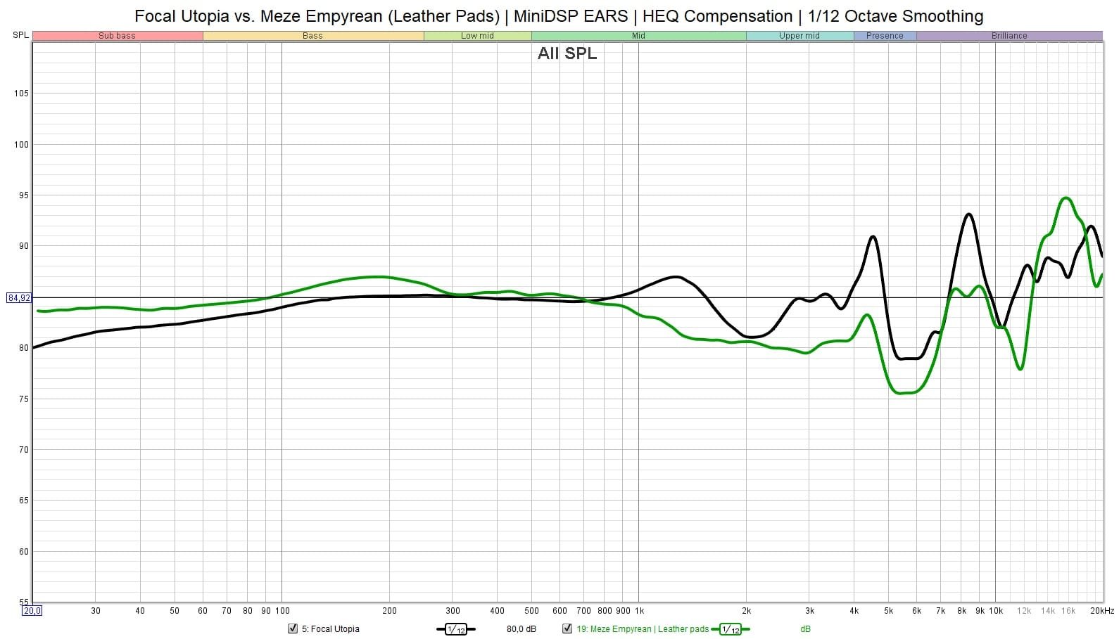 Omat MiniDSP EARS -mittaukseni Utopian (musta) ja Empyreanin (vihreä) taajuusvasteista. Kuten aiemmin mainitsin, Utopian taajuusvasteessa on ylätaajuuksilla suurta mittauslaitteesta johtuvaa epätarkkuutta.