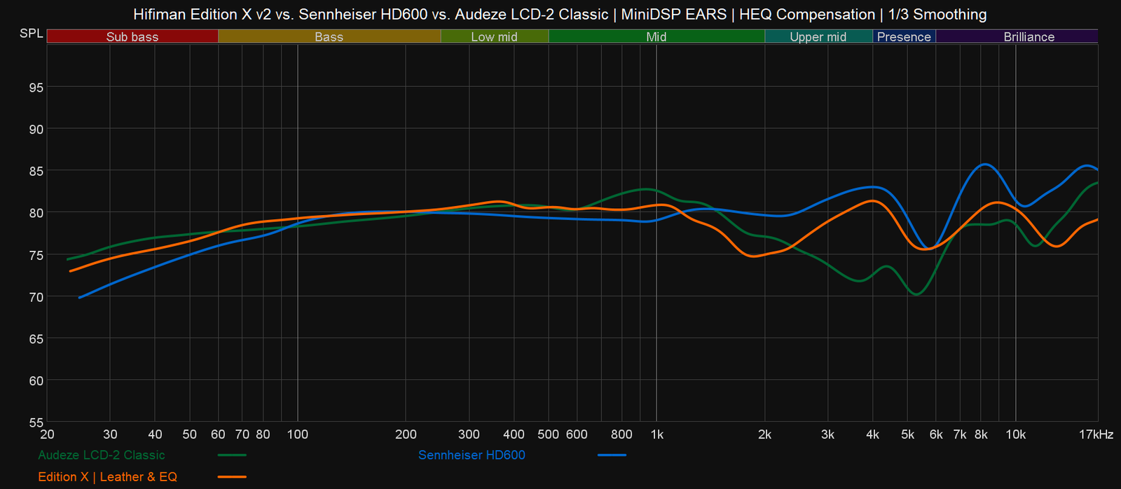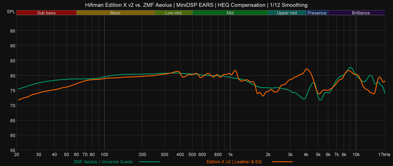 Mainitsemistani ZMF:n malleista Aeolus on lähempänä Edition X v2:n rauhallista esitystyyliä, sillä Auteurin keskitaajuuksien tuunaus on molempia malleja energisempi, vaikkei se 2 kHz:n kohdalta MiniDSP EARS -mittauksiini tallennukaan. ZMF:n kuulokkeet ovat hankalia mitattavia, koska niissä on suuret korvapehmusteet ja puiset kupit, jotka tekevät myös avoimista malleista osittain suljettuja.