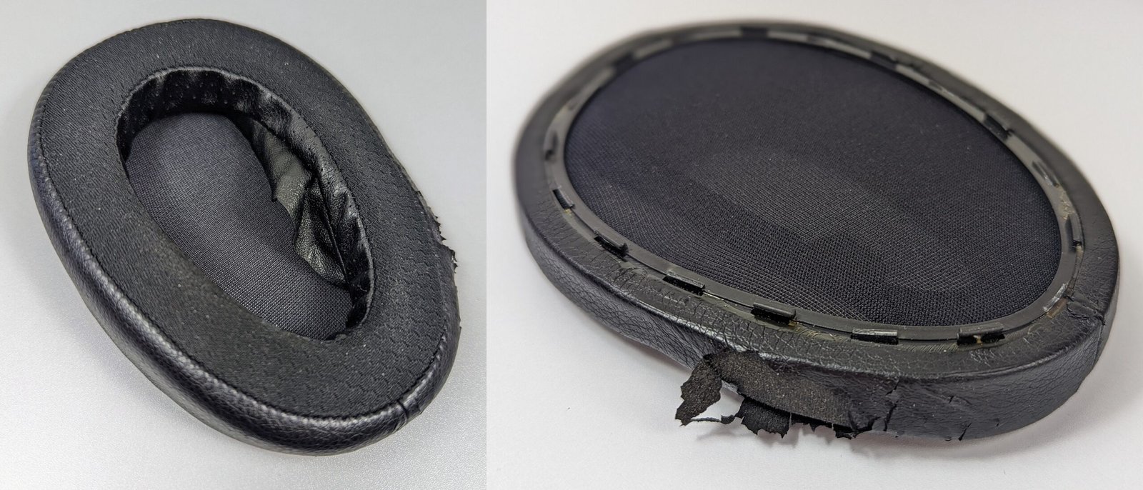 Pehmusteet on sentään mahdollista vaihtaa, koska ne kiinnittyvät kuulokkeisiin muovisessa takalevyssä olevien hakasten avulla. Omat pehmusteeni ovat käyttöikänsä päässä, koska toisen liimaus on revennyt sisäpuolelta, ja molempien pehmusteiden heikkolaatuinen keinonahka halkeilee irti pieninä paloina.