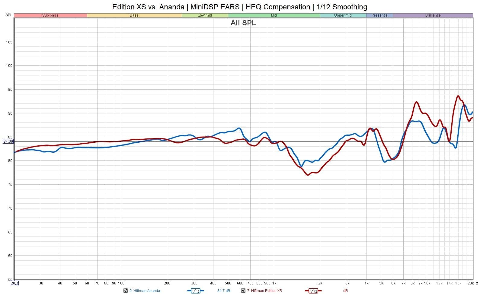 Edition XS on taajuusvasteeltaan todella tasapainoinen. Hifimanin kuulokkeille tyypillinen 1,25–2,5 kHz:n vaimentuma erottuu kuitenkin selkeästi kokonaisuudesta. Kuoppa 6 kHz:n kohdalla sekä 8,5 kHz:n korostuman korkeus ovat MiniDSP EARS -laitteesta johtuvia mittausvirheitä.
