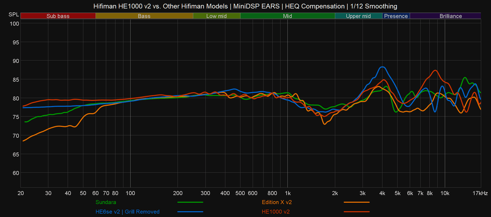 Monissa avoimissa planaarikuulokkeissa on melko lineaarinen bassontoisto, mutta bassotaajuudet näyttäytyvät silti MiniDSP EARS -laitteella HEQ-kompensaation mukaisesti mitatussa taajuusvasteessa loivasti alaspäin laskevina. HE1000 v2:n basso mittautuu kuitenkin poikkeuksellisesti lähes suorana viivana, tai pehmusteiden sulkevuudesta riippuen jopa hieman koholla olevana. Kuulokkeet korostavat myös aavistuksen ylempiä bassotaajuuksia dynaamisella elementillä varustettujen kuulokkeiden tapaan. Määrällisesti basso onkin avoimille kuulokkeille lähestulkoon täydellistä, koska myös alabasso toistuu ihailtavan kuuluvasti.