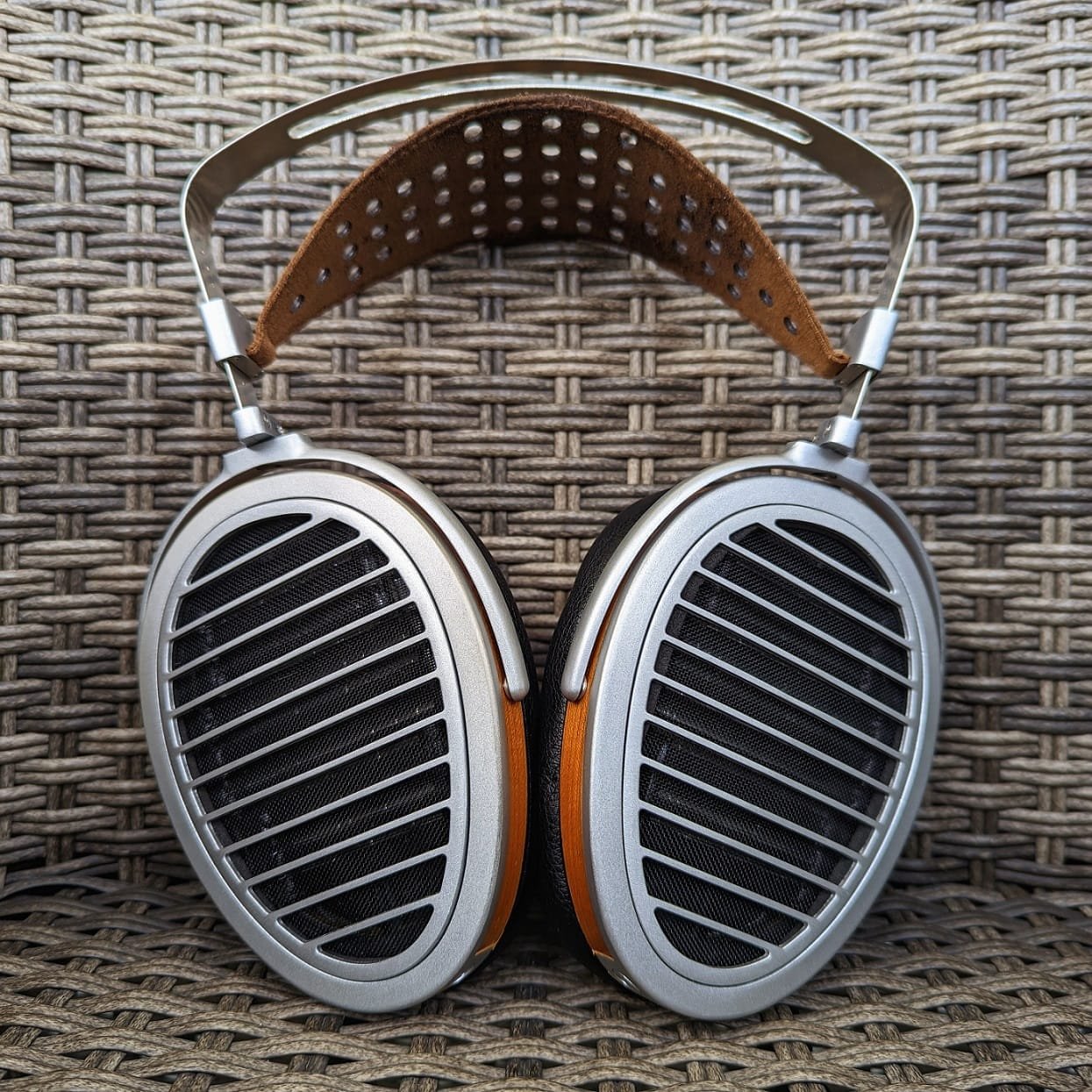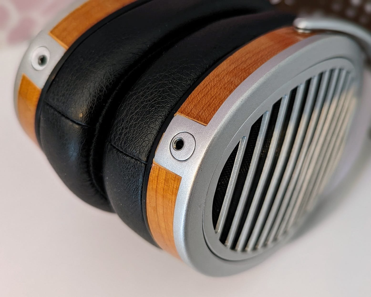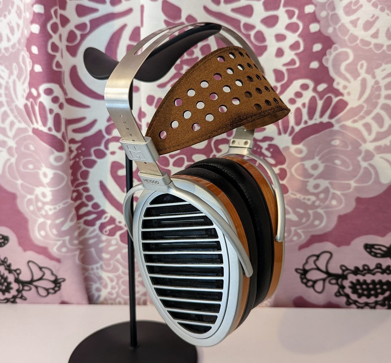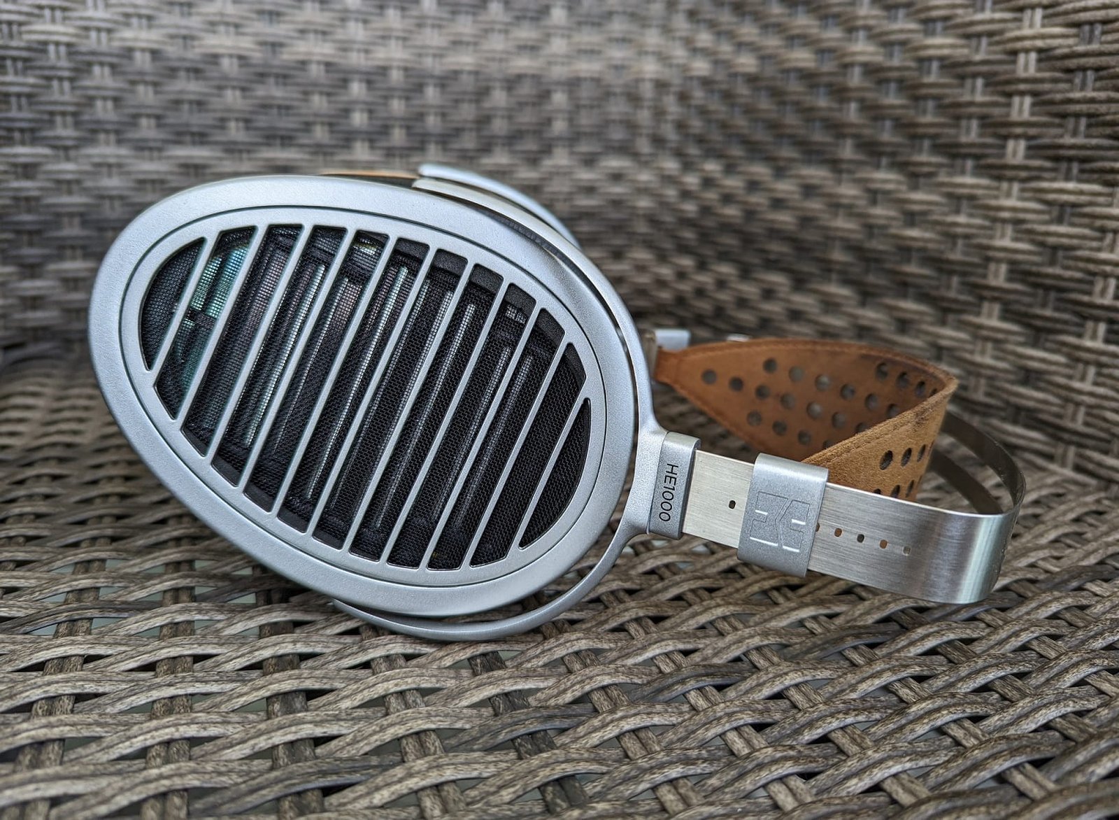 Pidän kuulokkeiden metallisesta värityksestä. Jostakin syystä Hifiman on halunnut lisätä kuppien sivulle oranssit puuviilukaistaleet, mutta nekin näyttävät onneksi livenä paremmalta kuin kuvissa. Valmistajan edullisempien mallien pääpannan pehmuste on tehty keinonahasta, kun taas HE1000-mallissa se on aitoa nahkaa. Itselläni ruskea nahkaosa on hieman tummunut, mutta kuulokkeeni eivät olekaan uudet. Iästä riippumatta HE1000:n huvittava ominaispiirre on nahkaosan pehmeneminen kapeista kiinnityskohdistaan, jolloin se alkaa lerpattaa löysänä puolelta toiselle. Vaikka asialla ei olekaan merkitystä kuulokkeita päässä pitäessä, se on yksi lisätodiste Hifimanin kyseenalaisesta laadusta myös kalliimmissa hintaluokissa.