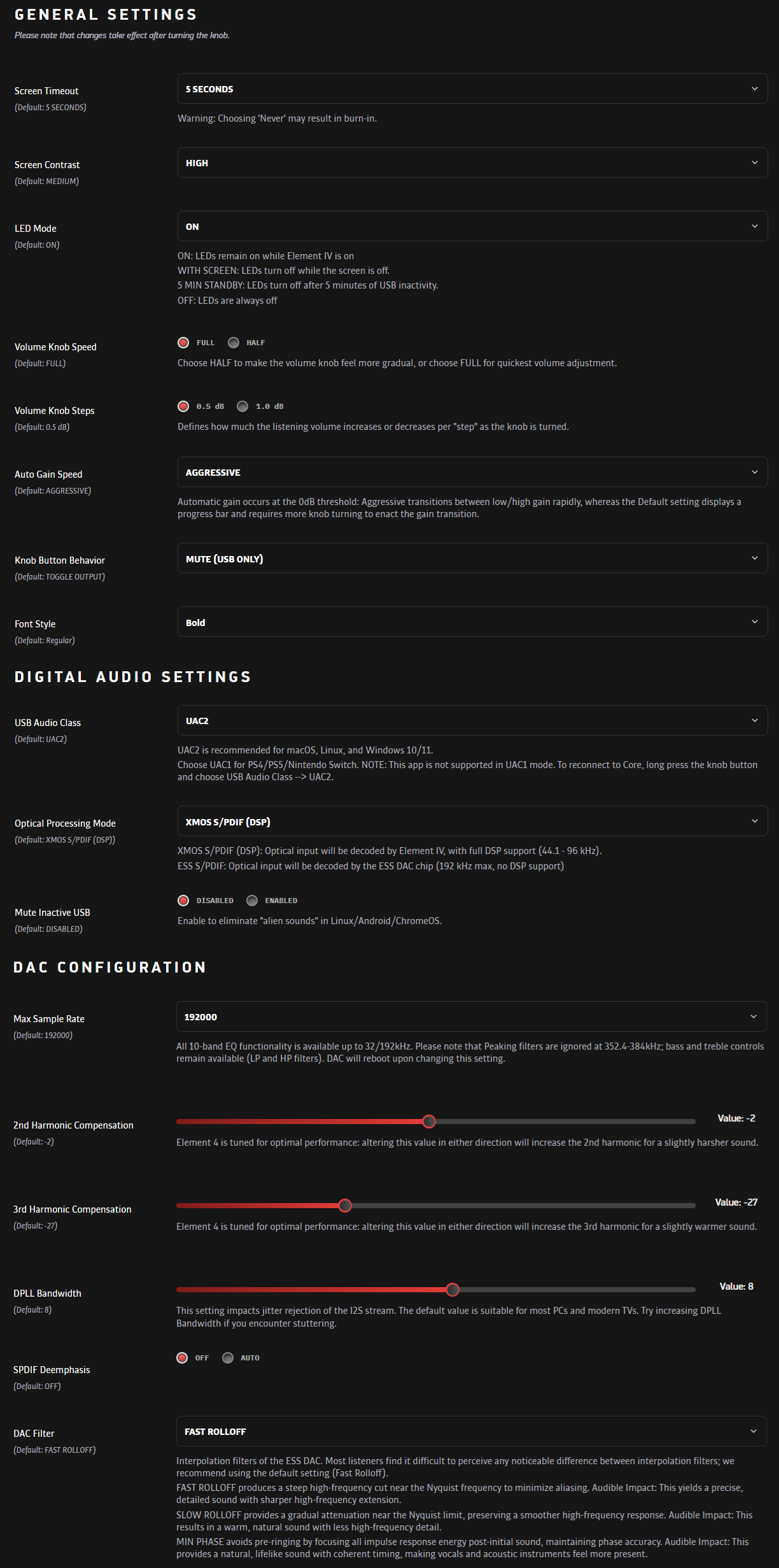 Core-käyttöliittymästä löytyy luonnollisesti myös monia yleisasetuksia, joiden muuttaminen tätä kautta onkin helpompaa kuin laitteen pieneltä näytöltä käsin. Erikseen mainittakoon Element IV:n toimivan myös pelikonsoleiden kanssa, koska se voidaan asettaa UAC1-USB-tilaan. DAC-filtterikin on vaihdettavissa, jos joku huomaa niiden välillä äänenlaadullista eroa. Erikoisimpia asetuksia ovat DAC-piirin särökompensaatiot, joita muuttamalla särön määrän tulisi lisääntyä ja johtaa joko hieman karkeampaan tai lämpöisempään ääneen. En äkkiseltään huomannut merkittävää eroa, joten olen jättänyt nämä säätimet optimaalisille oletusasetuksilleen.
