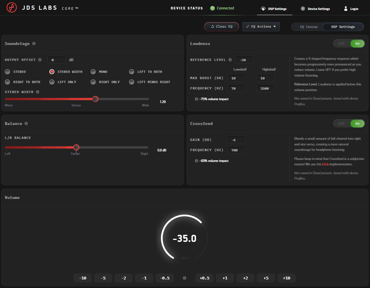 Luxsin X9:n tapaan JDS Labs:in laitteella päästään säätämään myös stereokuvan laajuutta, mitä kannattaa mielestäni ehdottomasti kokeilla. Sopivan maltillisesti lisättynä en ole havainnut tässä ominaisuudessa varsinaisia haittapuolia, vaan äänikuva kirjaimellisesti laajenee sivuttaissuunnassa enemmän pään ulkopuolelle. Koska lopputulos muistuttaa hyvin paljon Luxsinin laitetta, kyseessä lienee sama toimintalogiikka, jossa tarkkaillaan äänisignaalin samankaltaisuuksia ja eroavaisuuksia oikean ja vasemman kanavan välillä. Molemmille kanaville yhteiset ja samanaikaisesti toistuvat taajuudet säilytetään ennallaan, kun taas eroavia taajuuksia voimistetaan, jolloin ne vaikuttavat kuuluvan yhä enemmän vasemmalla tai oikealla.