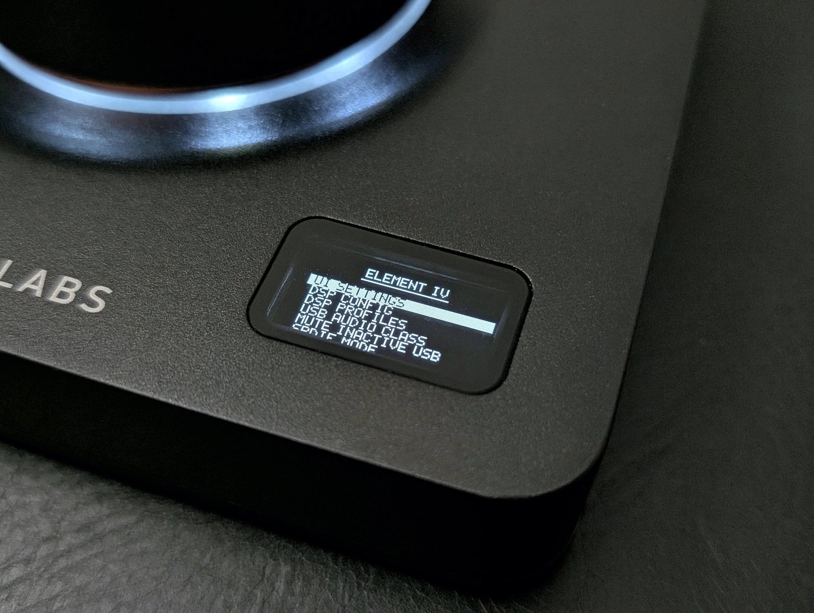 Laitteen yläkanteen on asennettu pieni OLED-näyttö osoittamaan äänenvoimakkuutta, kullakin hetkellä toteutuvaa näytteenottotaajuutta sekä mahdollisia DSP-asetuksia, joista kerron kohta lisää. Vaikka näytölle ei mahdukaan paljoa informaatiota ja sekin osoittaa taivasta kohti, laaja katselukulma mahdollistaa kuitenkin valitun volume-asetuksen näkymisen riittävän kauas – etenkin lihavoitu fontti asetuksista valitsemalla. Ylimääräisistä ledeistä häiriintyvät voivat kytkeä pois päältä äänenvoimakkuudensäätimen ympärillä kulkevan valkoisen ledirenkaan, jolloin Element IV saadaan pimennettyä käytön aikana kokonaan. Näyttö herää henkiin muutamaksi sekunniksi vain äänenvoimakkuutta muuttaessa ja tällöinkin kirkkautta voidaan laskea.