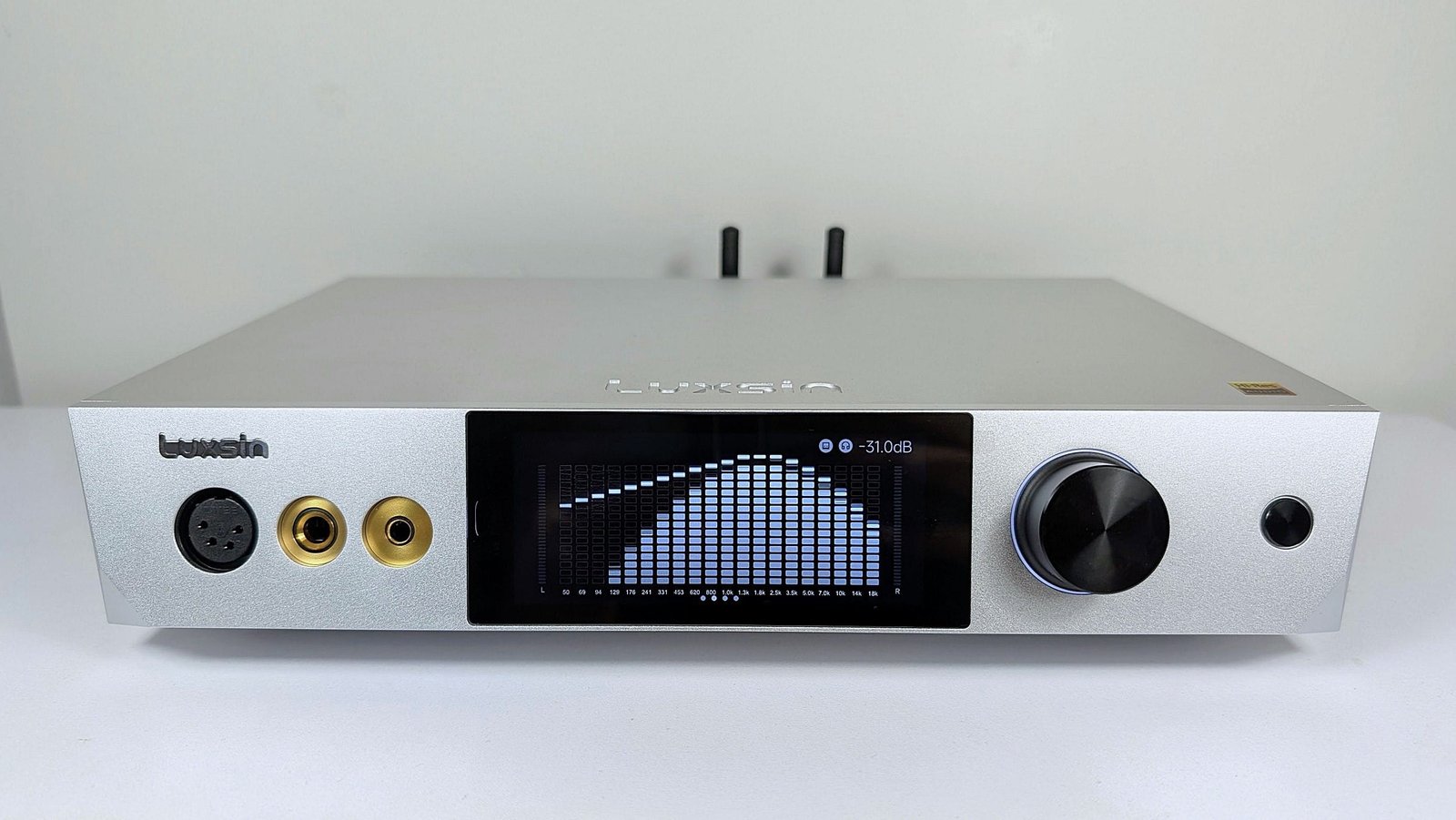 X9 on ensinnäkin mahdottoman tyylikäs ja laadukkaasti viimeistelty laite, joka painaakin jykevien alumiinikuoriensa myötä peräti 3,7 kiloa. Pidän 15 astetta ylöspäin kallistetusta etupaneelista visuaalisesti, mutta kallistus helpottaa myös käyttöä. Muotoillut kulmat saavat niin ikään laitteen näyttämään hieman mielenkiintoisemmalta. Suurin huomioni käytön aikana keskittyy silti neljän tuuman kosketusnäyttöön, jolla voidaan esittää esimerkiksi erilaisia digitaalisia VU-mittareita tai äänisignaalin taajuussisältöä palkkien muodossa (tällä hetkellä 12 eri visualisointivaihtoehtoa). Vertailun vuoksi omistamani Topping Centaurus -DAC:in pieni näyttö näyttää paksun reunuksensa keskellä suorastaan surulliselta Luxsin X9:n rinnalla. Jos näytöstä kerran halutaan visuaalisesti hieno, sen on parasta olla suuri ja laadukas. Tarvittaessa X9:n näyttö ja potentiometrin ympärillä kiertävä valorengas voidaan myös pimentää, jolloin laitteesta ei synny esimerkiksi illalla käyttäessä minkäänlaista valosaastetta.