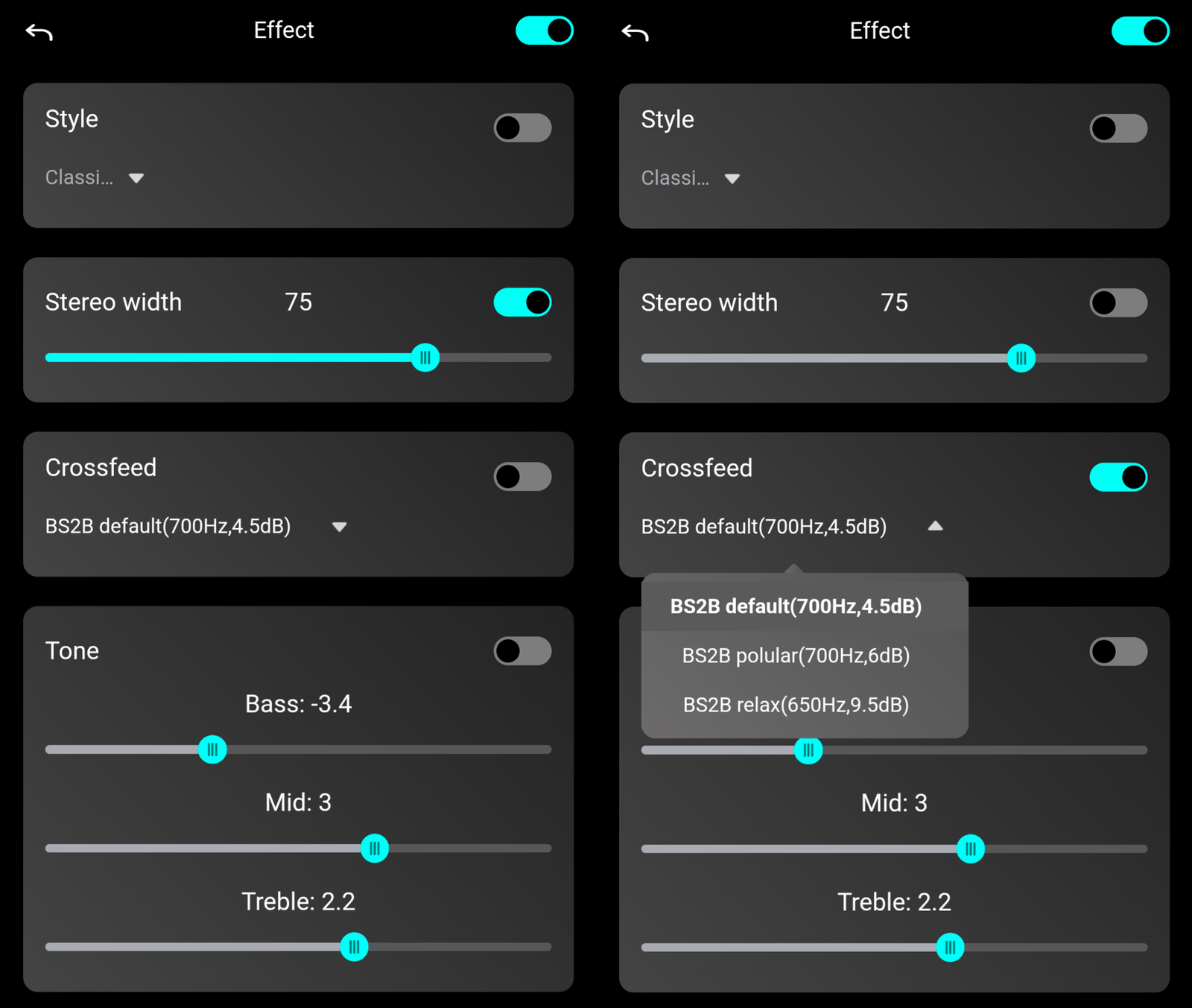 ”Style”-valikosta löytyy puolestaan pitkä lista erilaisia ääniprofiileita, joiden olisi tarkoitus sopia tietylle musiikkigenrelle (esim. rock tai klassinen) tai tietynlaiseen kuuntelufiilikseen (esim. soft, full bass tai party). Harmillisesti asetuksissa ei kuitenkaan ole taajuusvastemuutosten näkökulmasta kunnollista logiikkaa, vaan jokainen niistä kuulostaa enemmän tai vähemmän epäluonnolliselta. Varoituksen sanana suosittelen välttämään Full Treble -profiilia, sillä korvani vuotavat edelleen hieman verta sen jäljiltä. Toki jos kuulokkeet tai kaiuttimet eivät toistaisi juurikaan diskanttia, tai laitteen käyttäjän kuuloaisti olisi sen osalta heikentynyt, tällä profiililla tilanne saataisiin korjattua.