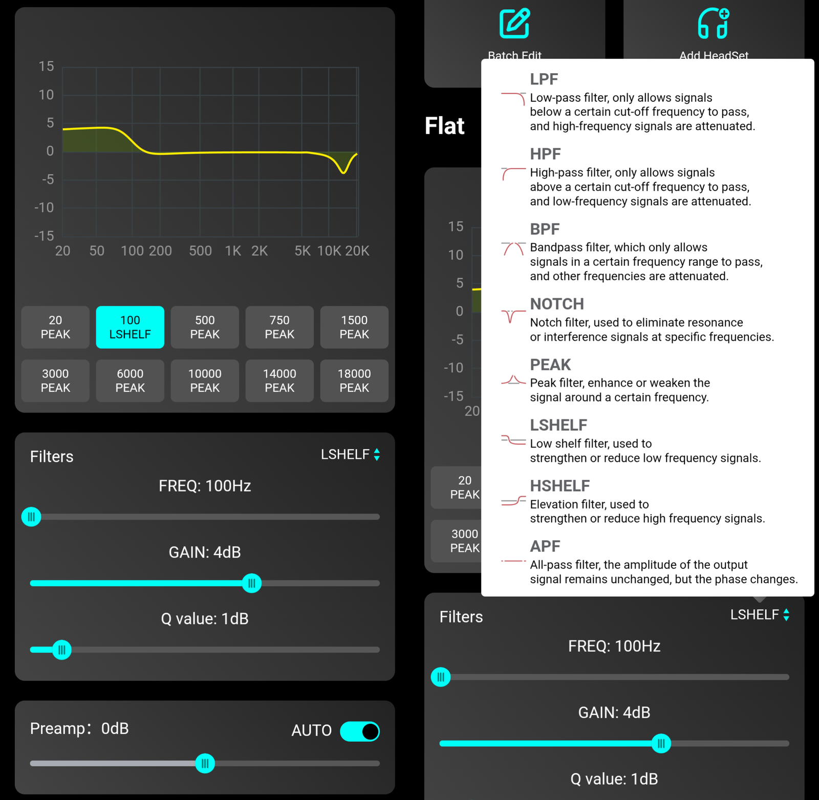 Laite sisältää ensinnäkin 10-kanavaisen parametrisen taajuuskorjaimen HP-EQ-toiminnolla, joka vastaa toimintaperiaatteeltaan Jaakko Pasasen kehittämää AutoEQ-työkalua. Lähtötiedoiksi valitaan listalta oma kuulokemalli ja toivottu tavoitekäyrä (esim. Harman 2018), minkä jälkeen ohjelmisto laskee sopivaksi näkemänsä taajuuskorjauksen automaattisesti. Tämän helpompaa ei taajuuskorjaaminen voisi enää olla etenkään, kun Luxsinin tietokanta sisältää tällä hetkellä tiedot yli 2500 kuulokemallista tai niiden eri versioista (esim. erilaiset korvapehmusteet). Kannattaa toki huomioida, että X9 vaatii langattoman verkkoyhteyden päästäkseen käsiksi kuulokkeiden taajuusvasteet sisältävään tietokantaan. Niin ikään mobiilisovellusta käyttäessä laitteen tulee olla yhdistettynä esimerkiksi puhelimen kanssa samaan langattomaan verkkoon, joskin vaihtoehtoisesti sovellusta voidaan käyttää myös tietokoneella syöttämällä sopiva IP-osoite nettiselaimen osoiteriville.