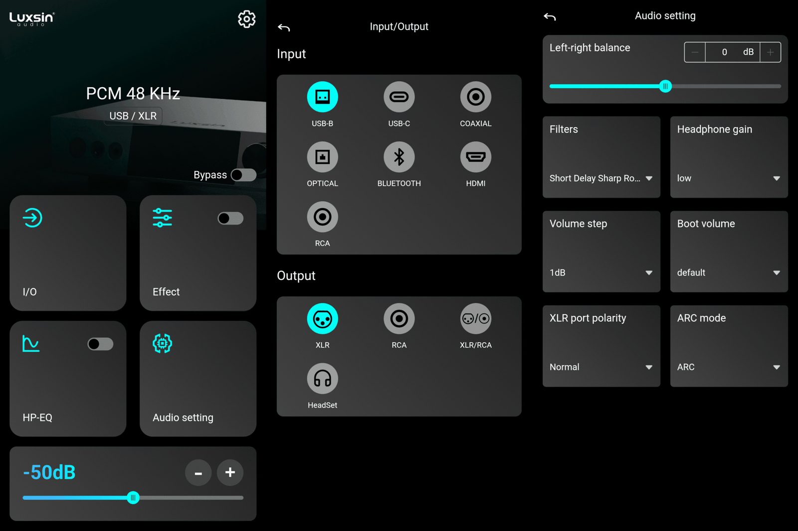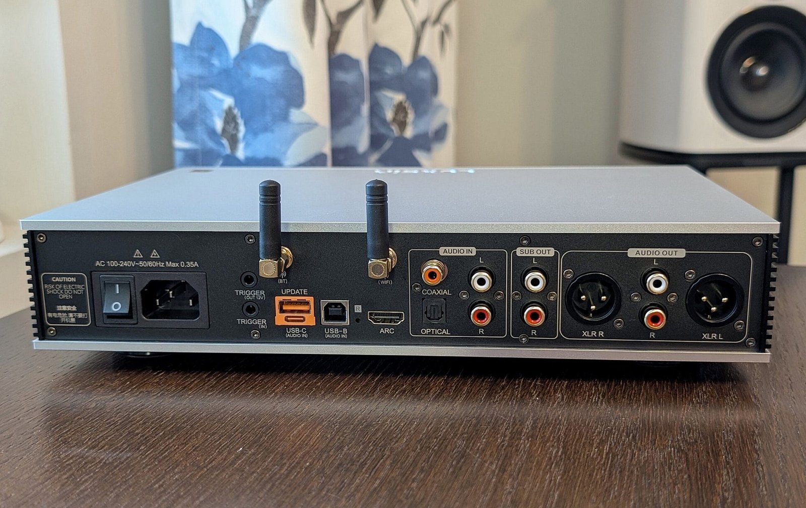 Tavanomaisten digitaalisten sisääntulojen (USB-B, USB-C, Optical & Coaxial) lisäksi Luxsin on lisännyt mukaan myös HDMI ARC/EARC -liittimen, joten laitteeseen saadaan kiinni näppärästi vaikkapa televisio. Olohuonekäyttöä ajatellen laitteesta löytyy lisäksi kaksi subwoofer-lähtöä eli se pystyy olemaan täysiverinen DAC ja esivahvistin subwooferilla ryyditetyille aktiviikaiuttimille etenkin, kun asetusvalikossa piileskelee monipuolisesti säädettävissä oleva jakosuodin. Sekä HDMI-liitin että subwoofer-lähdöt ovat harvinaisia ominaisuuksia tässä tuotekategoriassa.