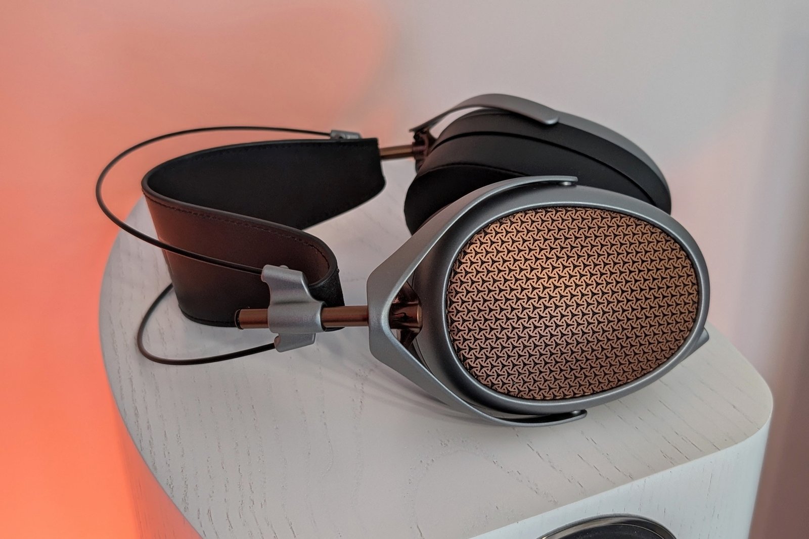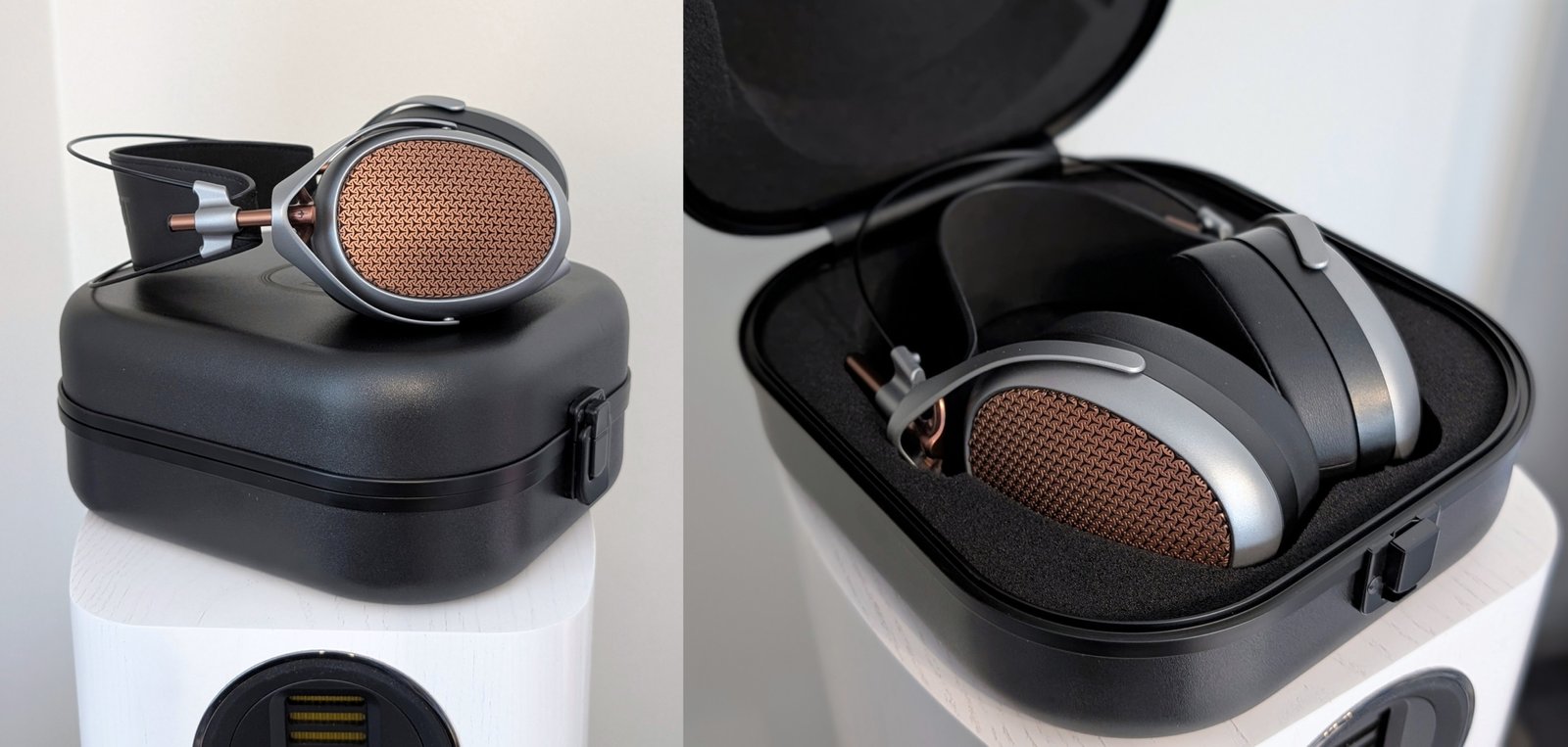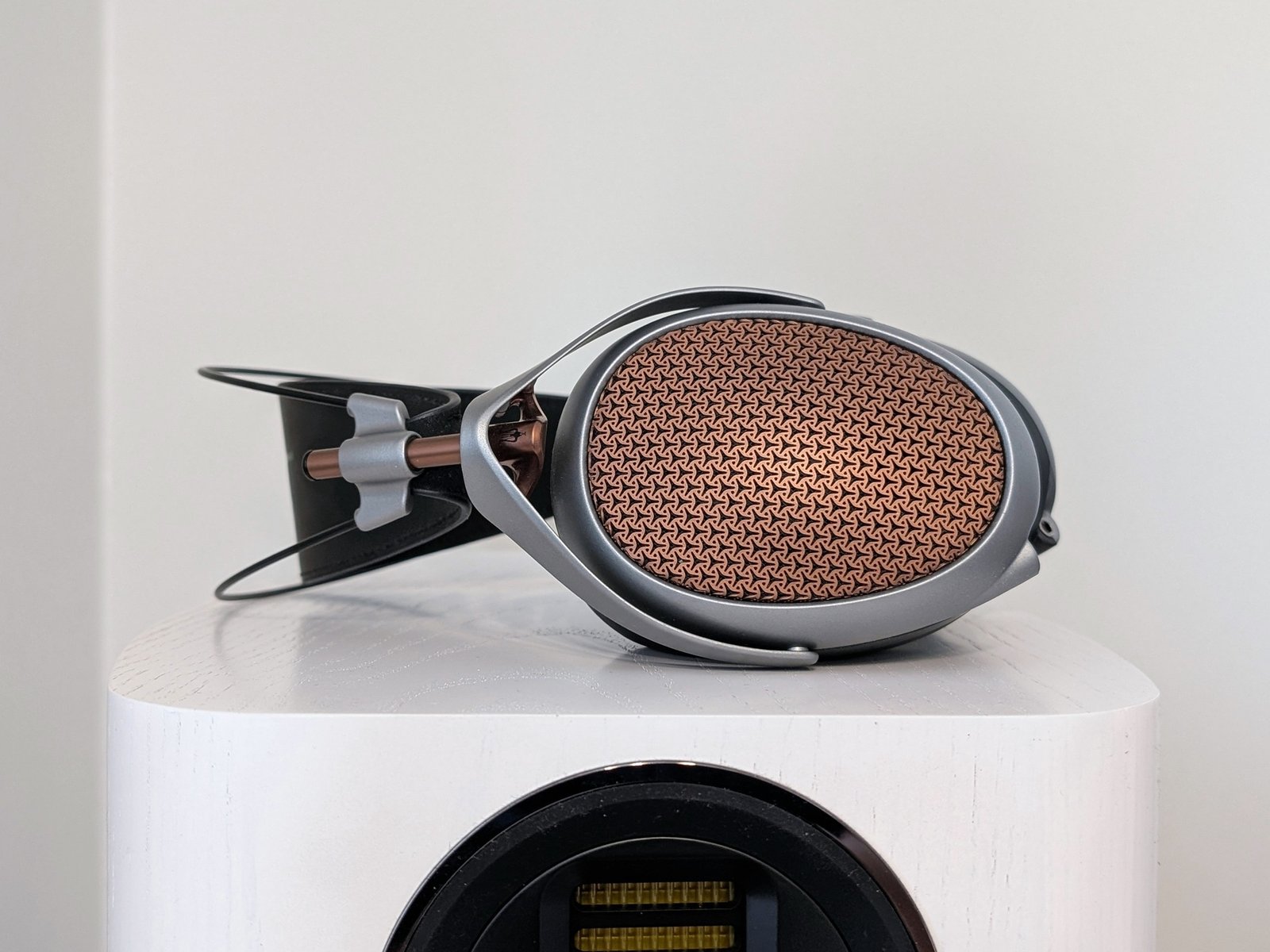 Koska POET pohjautuu LIRIC-sarjan runkoon, se on kooltaan Empyrean-sarjaa kompaktimpi ja noin 50 grammaa kevyempi. Kuulokkeiden tarkasti työstetyssä rakenteessa yhdistellään harmaata magnesiumia ja mustaa muovia, joita piristävät väriltään kupariset Meze-ritilät ja korkeuden säätämiseen tarkoitetut putket. Pääpanta puolestaan koostuu kahdesta titaanitangosta (soivat tökkäistessä), jotka tuovat mieleeni Dan Clark Audion kuulokkeet (esim. Noire X). Kokonaisuus ei omiin silmiini näytä täydellisen yhtenäiseltä, muttei siinä varsinaisia säröjäkään ole. Kyllä POET:ia ehdottomasti kehtaa muille esitellä ja täytyyhän Empyrean-sarjan edelleen näyttää vieläkin paremmalta.