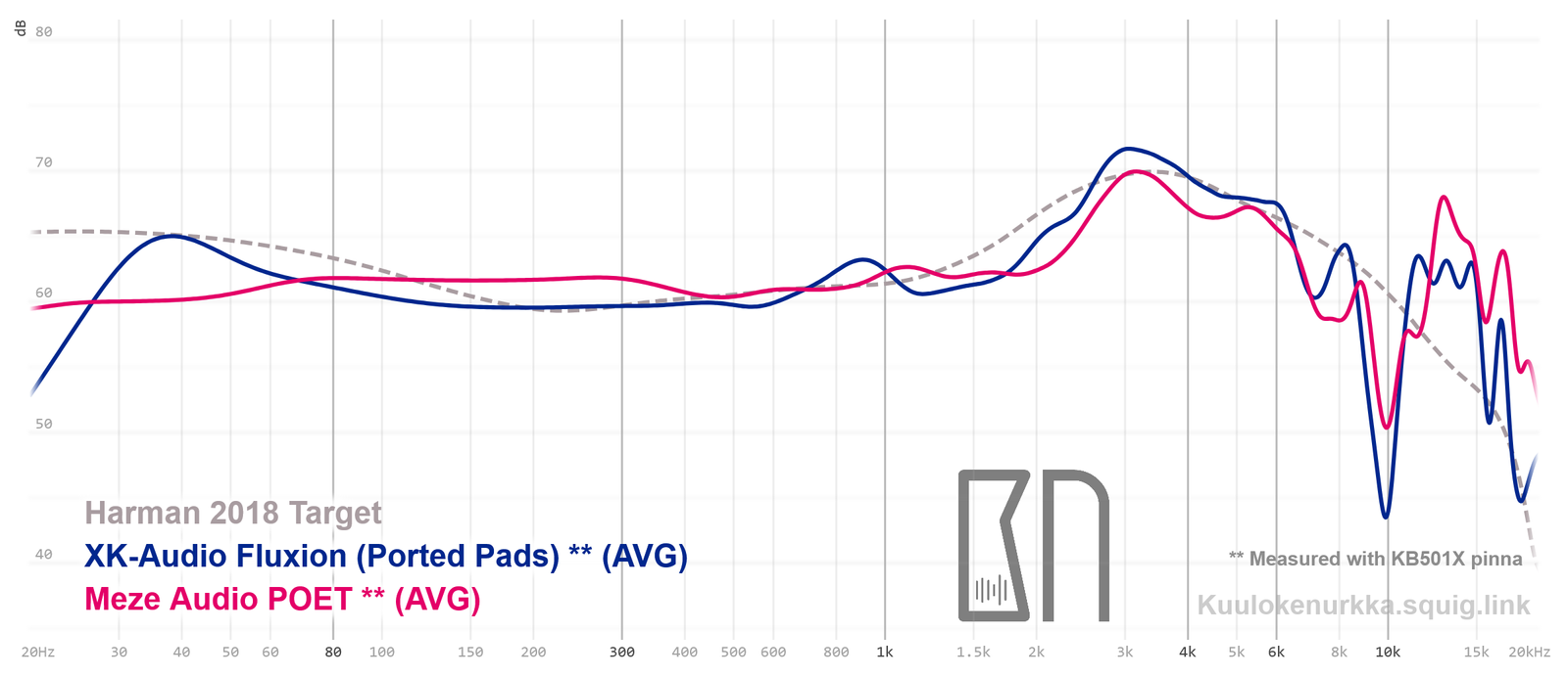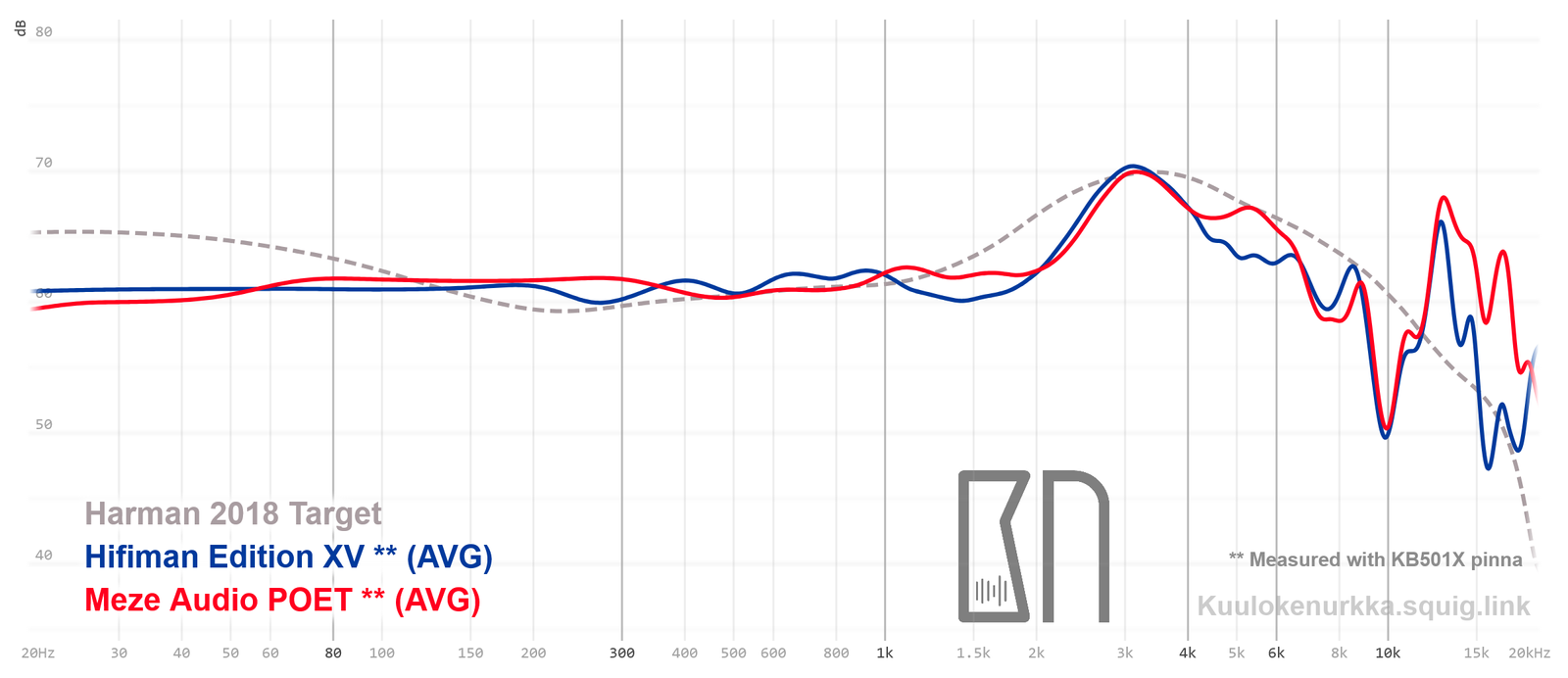 Kuulokkeiden taajuusvastemittaukset on tehty IEC711-standardin mukaisella laitteistolla ja KB501X-mallisilla silikonikorvilla. Kuvaajissa käytetään vertailupohjana tieteelliseen tutkimukseen pohjautuvaa Harmanin tavoitekäyrää (vuoden 2018 versio), joka on yleistys siitä, millaisen taajuusvasteen mukainen ääni kuulostaisi suurimman osan mielestä hyvältä ja vastaisi tasapainoisia kaiuttimia hyvin akustoidussa huoneessa. Lisätietoa mittauksista ja niiden tarkkuudesta löytyy Taajuusvastemittaukset-sivulta. POET:in taajuusvaste on myös vertailtavissa muiden mitattujen kuulokkeiden kanssa Squiglink-vertailutyökalun avulla.