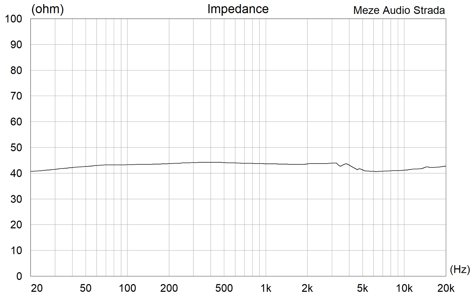 STRADA:n nimellisimpedanssiksi ilmoitetaan 109 Pro -mallin tapaan 40 ohmia, mikä omien mittausteni perusteella ylittyy muutamalla ohmilla. Impedanssikäyrä on kuitenkin kaikessa lineaarisuudessaan käytännöllinen, koska vahvistimen lähtöimpedanssiin ei tarvitse juurikaan kiinnittää huomiota. Enimmillään ylätaajuudet hieman rauhoittuisivat, mikä ei STRADA:n tapauksessa olisi haitallista.