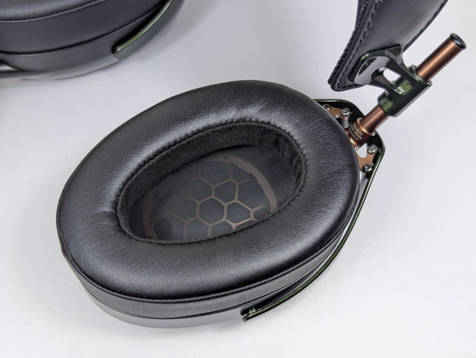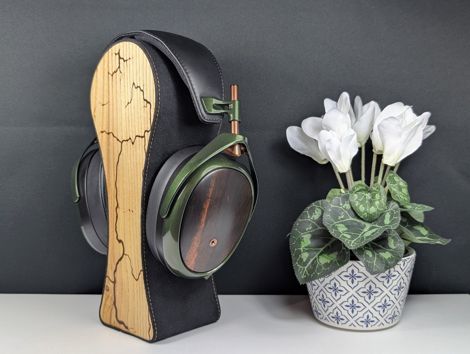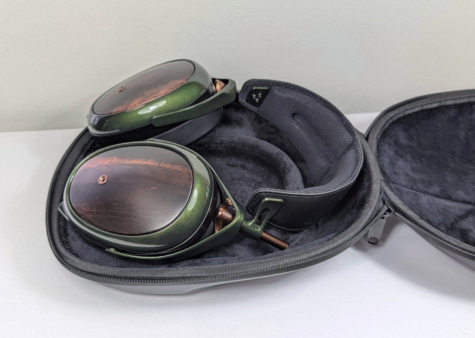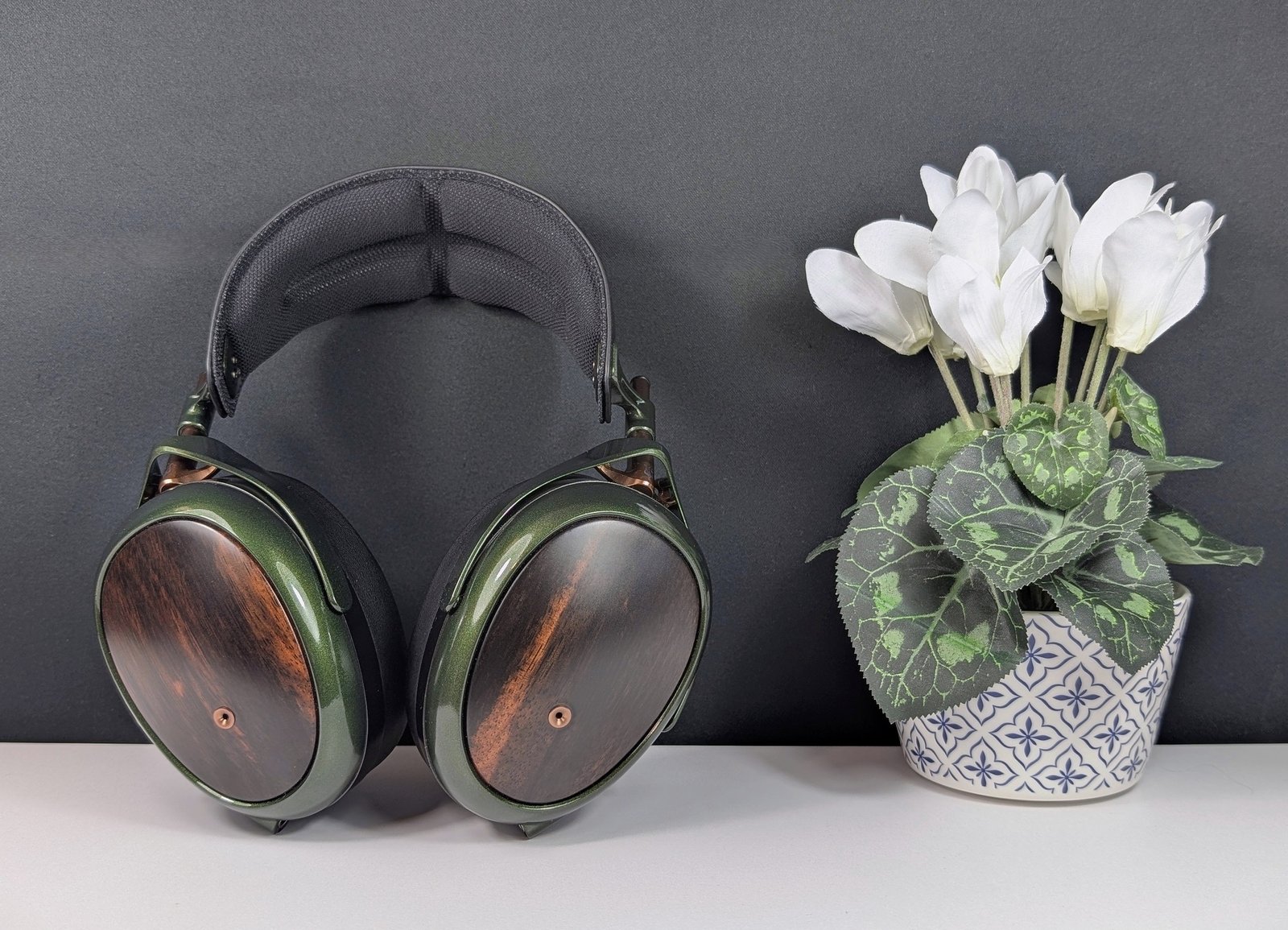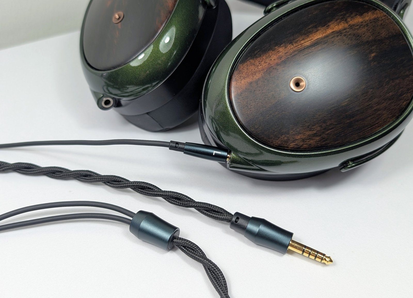 Ulkoisesti STRADA saattaa tosin jakaa mielipiteitä, sillä sen magnesium-osat on maalattu käsin metallinhohtoisen vihreiksi. Neljä maalikerrosta tekevät pinnasta liukkaan ja pehmeän, joten myönnän erehtyneeni luulemaan metalliosia muovisiksi etenkin, kun ohut sanka antaa hieman periksi puristellessa. Kuppien kyljet puolestaan on valmistettu upeasta makassarin eebenpuusta, joka näyttää jokaisessa kuulokeyksilössä uniikilta. Testikuulokkeisiini on sattunut pääasiassa tummaa puuta, mutta olen nähnyt myös hyvin vaaleita sekä raidallisia yksilöitä.