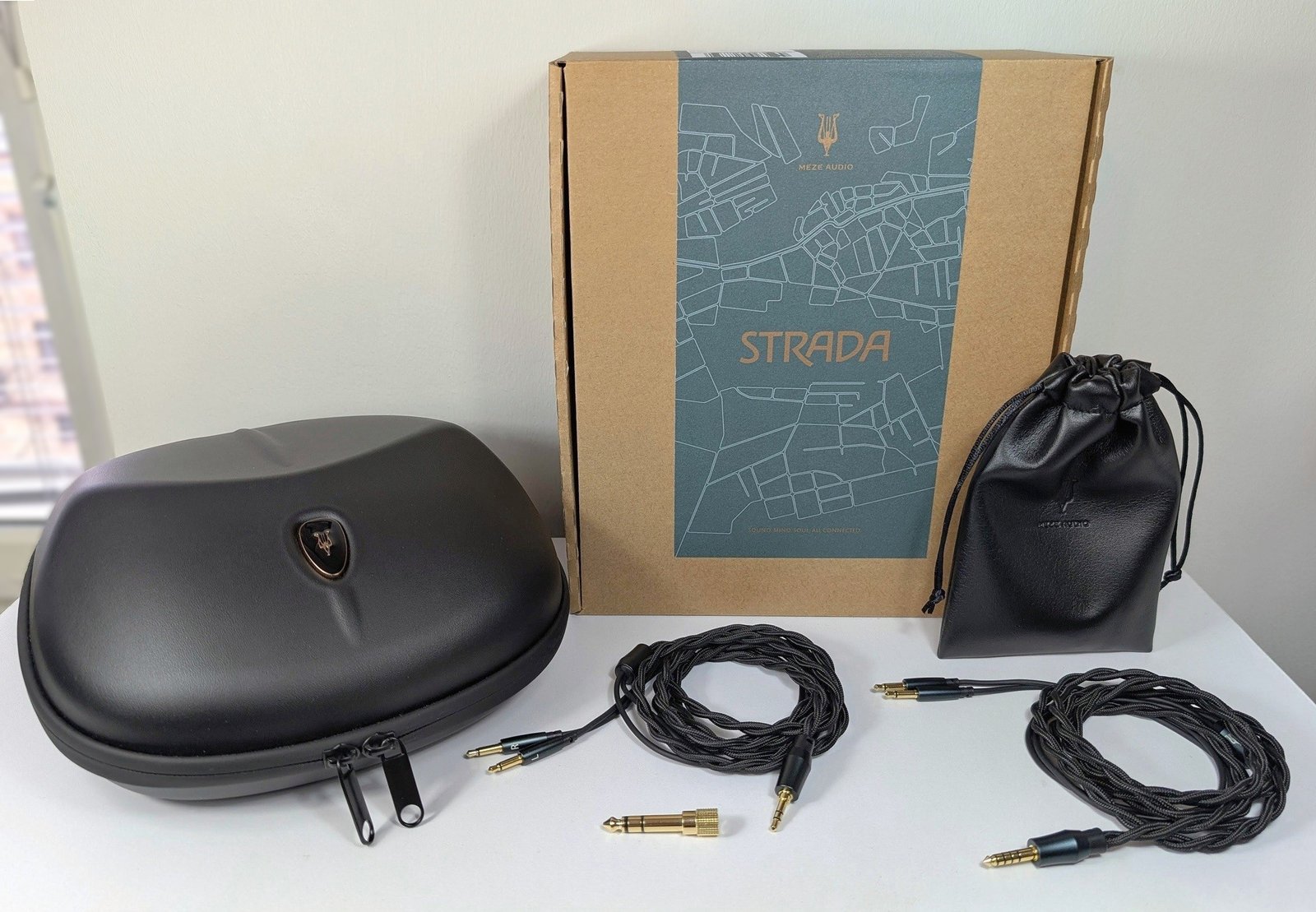 Vaikkei STRADA:n pelkistetty pahvilaatikko välttämättä herätäkään suurempia odotuksia, kuulokkeiden varustelu on laadukas. Ostaja saa suuren keinonahalla ja sametilla vuoratun kuljetuskotelon sekä erilliseen pussiin pakattuna kaksi arvokkaalta tuntuvaa kaapelia. Yksi kaapeleista on balansoimaton (3,5/6,35 mm) ja toinen balansoitu (4,4 mm) – molempien pituus sopiva 1,8 metriä. LIRIC- ja POET-kuulokkeiden tapaan kiinnitys kuulokekuppeihin tapahtuu kahdella 3,5 millimetrin liittimellä, joten lisäkaapeleitakin löytyy suhteellisen helposti, jos joku sellaisia tarvitsee.