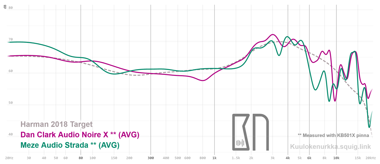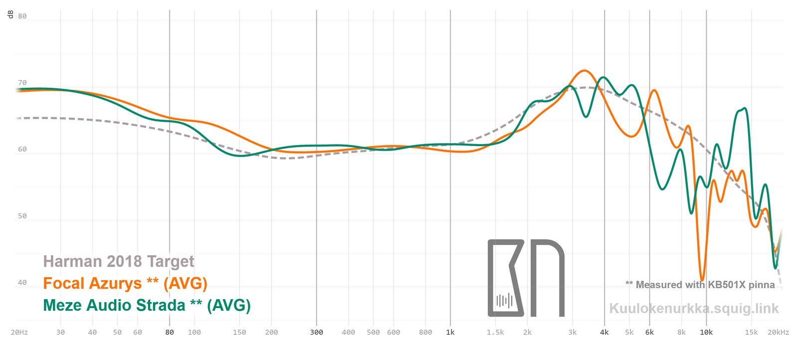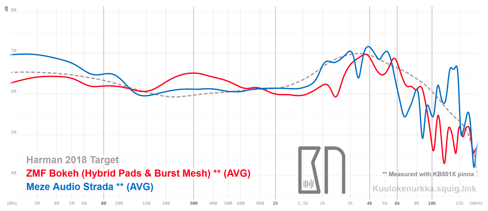 Kuulokkeiden taajuusvastemittaukset on tehty IEC711-standardin mukaisella laitteistolla ja KB501X-mallisilla silikonikorvilla. Kuvaajissa käytetään vertailupohjana tieteelliseen tutkimukseen pohjautuvaa Harmanin tavoitekäyrää (vuoden 2018 versio), joka on yleistys siitä, millaisen taajuusvasteen mukainen ääni kuulostaisi suurimman osan mielestä hyvältä ja vastaisi tasapainoisia kaiuttimia hyvin akustoidussa huoneessa. Lisätietoa mittauksista ja niiden tarkkuudesta löytyy Taajuusvastemittaukset-sivulta. STRADA:n taajuusvaste on myös vertailtavissa muiden mitattujen kuulokkeiden kanssa Squiglink-vertailutyökalun avulla.
