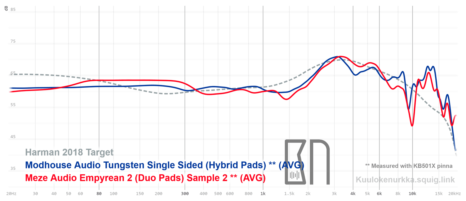 Jonkin aikaa Tungstenin kanssa yhtä aikaa omistamani Empyrean 2 kuulosti mielenkiintoisesti ylätaajuuksiltaan rauhallisemmalta kuin arvostelua varten lainaamani kuulokepari. En ole varma, kumpi Empyrean 2 edustaa Meze Audion tavoitteita paremmin, mutta vertailutilanne osoitti omat kuulokkeeni taajuusvasteeltaan yllättävänkin samankaltaisiksi Mod House Audio Tungstenin kanssa. Toisaalta pieniä eroja löytyi silti lähes jokaiselta taajuusalueelta, joten kaksikko kuulosti lopulta varsin erilaiselta.