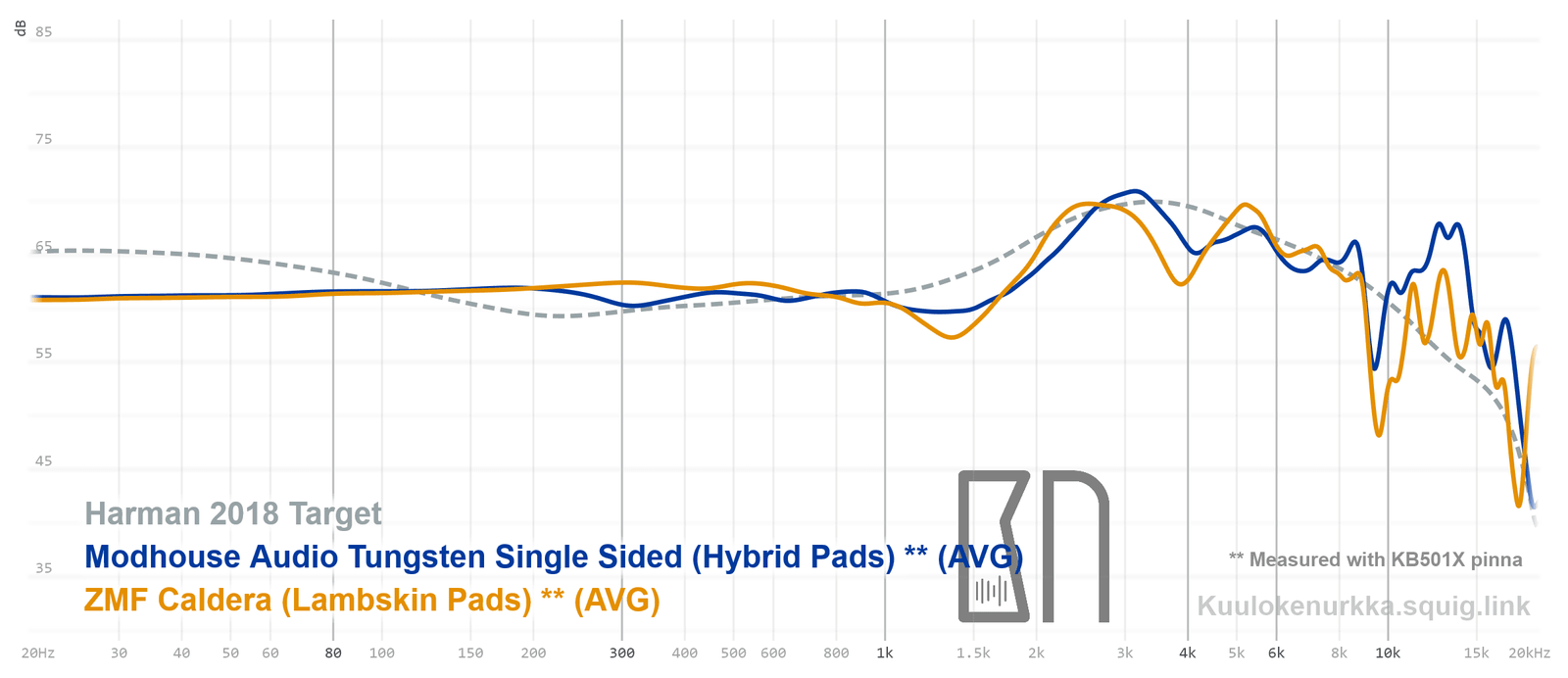 Tungsten ei luo laulajaan yhtä vahvaa yhteyttä, vaan hajauttaa kokonaisuuden tasapuolisemmin tarkasteltavaksi. Sen ääni on tyyliltään rauhallisempaa ja ilmavampaa. Huomioni kiinnittyy äänikuvassa tapahtuviin asioihin ja ylätaajuukien yksityiskohtaisuuteen enemmän kuin Calderaa kuunnellessa. Aistin kokonaisuuden läpinäkyvämmäksi ja eräällä tapaa vaivattomammaksi, kun taas Calderan ääni on fokusoituneempaa ja se tulee terävämmin päin näköä. Osittain tämä johtuu ZMF-mallin hitusen räiskyvistä ja epätasaisista ylätaajuuksista, joissa on ripaus ylimääräistä energiaa 9 kilohertsin paikkeilla (ei näy taajuusvastemittauksissani). Tungstenin diskantti kuulostaa omiin korviini sulavammalta, joskin korostuneen ilmavuutensa vuoksi sihahtelevalta. Molempiin tottuu, mutta mielenkiintoisesti pystyn kuuntelemaan Tungstenia lujemmalla äänenvoimakkuudella. Se on perinteisessä mielessä kaksikosta kirkkaampi kuuloke, muttei tasaisuutensa ansiosta täysin tunnu siltä.