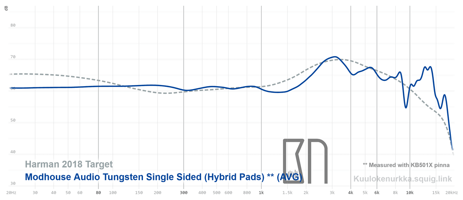 Kuulokkeiden taajuusvastemittaukset on tehty IEC711-standardin mukaisella laitteistolla ja KB501X-mallisilla silikonikorvilla. Kuvaajissa käytetään vertailupohjana tieteelliseen tutkimukseen pohjautuvaa Harmanin tavoitekäyrää (vuoden 2018 versio), joka on yleistys siitä, millaisen taajuusvasteen mukainen ääni kuulostaisi suurimman osan mielestä hyvältä ja vastaisi tasapainoisia kaiuttimia hyvin akustoidussa huoneessa. Lisätietoa mittauksista ja niiden tarkkuudesta löytyy Taajuusvastemittaukset-sivulta. Tungstenin taajuusvaste on myös vertailtavissa muiden mitattujen kuulokkeiden kanssa Squiglink-vertailutyökalun avulla.