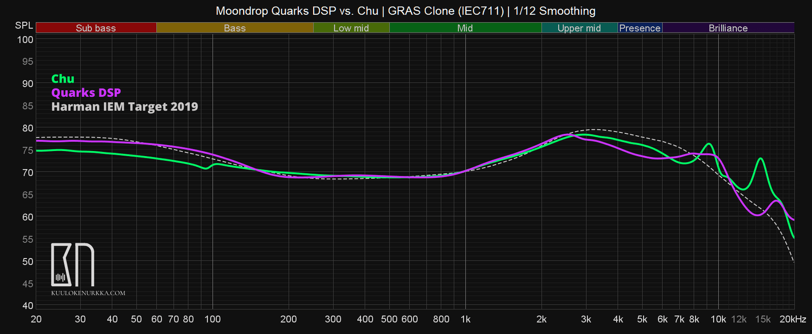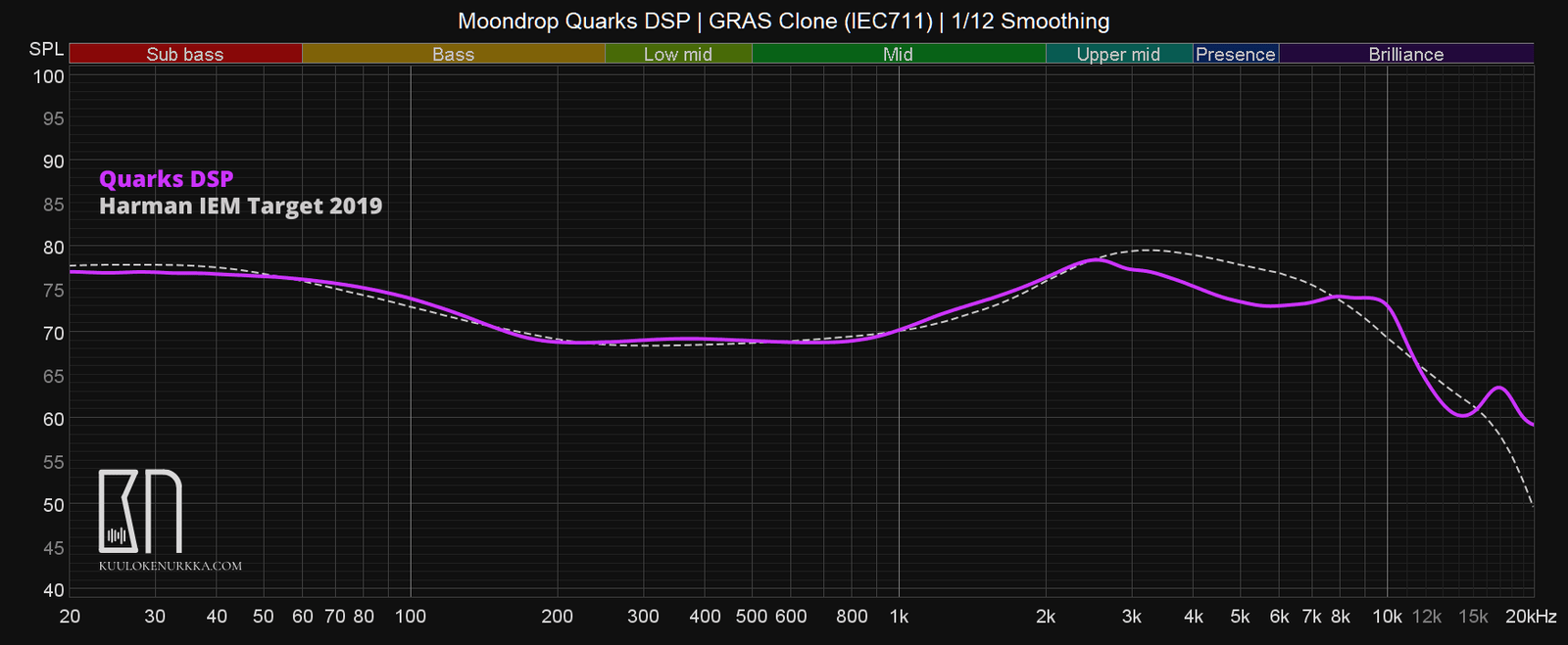 Harmanin tutkimus in-ear-kuulokkeille on kuitenkin edelleen jokseenkin puutteellista, koska koehenkilöiden ei ole annettu vaikuttaa basson määrän lisäksi riittävästi ylätaajuuksien määrään. Monet pitävätkin Harmanin tavoitekäyrää noudattavia in-ear-kuulokkeita turhan aggressiivisen kuuloisina, joten useimmat kuulokevalmistajatkin tuunaavat tuotteensa edelleen maltillisemmin. Moondrop tuunaa kuulokkeensa oman VDSF-tavoitekäyränsä mukaisesti. Tämä on tietoinen valinta, joten Harmanin tavoitekäyrä toimii omassa jutussani lähinnä suuntaa antavana vertailupohjana.