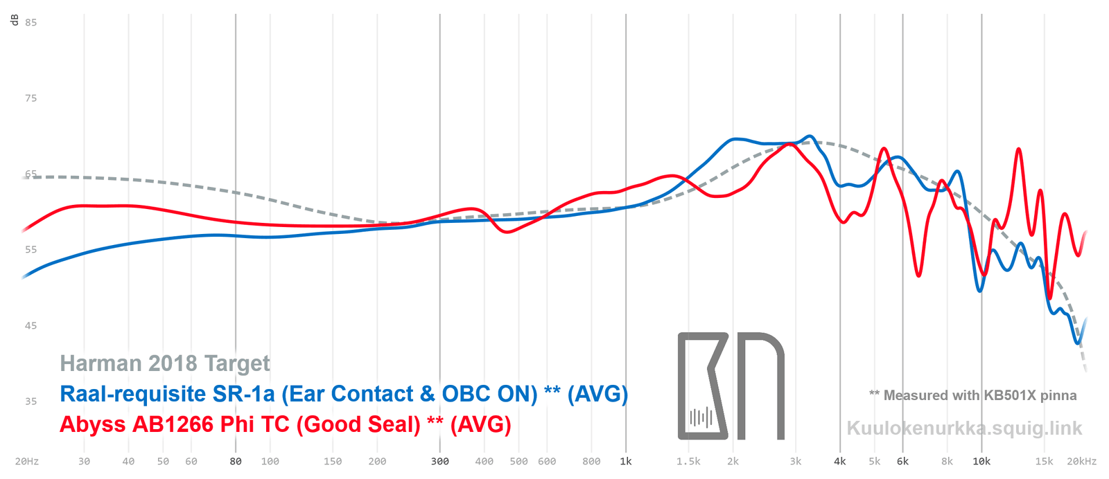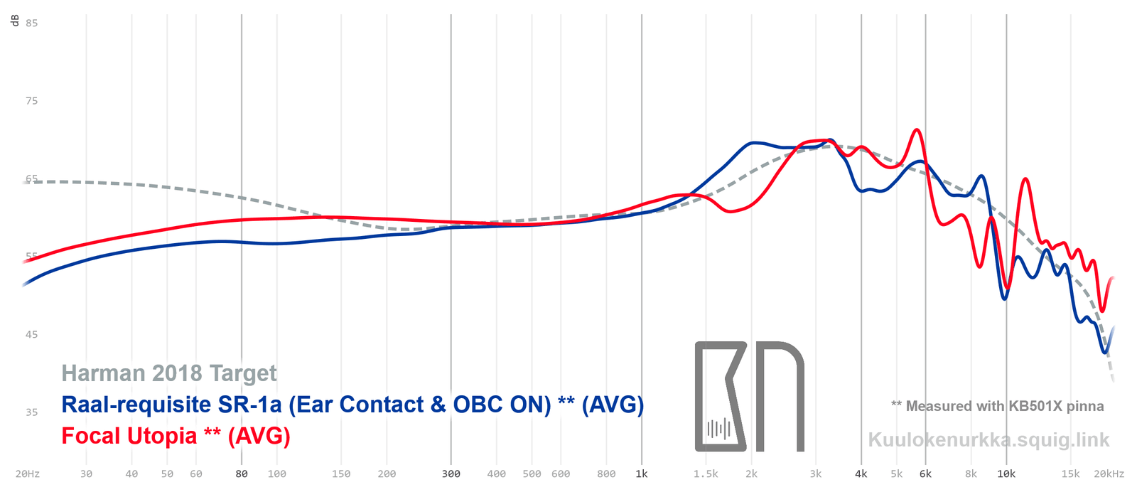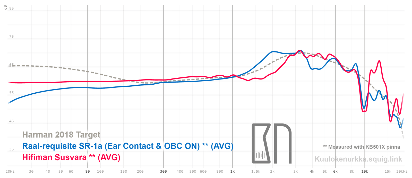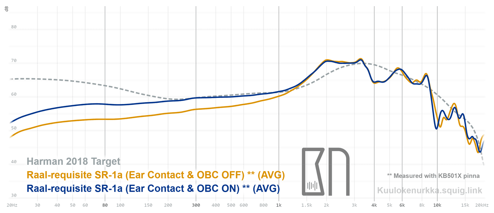 Kuulokkeiden taajuusvastemittaukset on tehty IEC711-standardin mukaisella laitteistolla ja KB501X-mallisilla silikonikorvilla. Kuvaajissa käytetään vertailupohjana tieteelliseen tutkimukseen pohjautuvaa Harmanin tavoitekäyrää (vuoden 2018 versio), joka on yleistys siitä, millaisen taajuusvasteen mukainen ääni kuulostaisi suurimman osan mielestä hyvältä ja vastaisi tasapainoisia kaiuttimia hyvin akustoidussa huoneessa. Lisätietoa mittauksista ja niiden tarkkuudesta löytyy Taajuusvastemittaukset-sivulta. SR-1a:n taajuusvaste on myös vertailtavissa muiden mitattujen kuulokkeiden kanssa Squiglink-vertailutyökalun avulla.