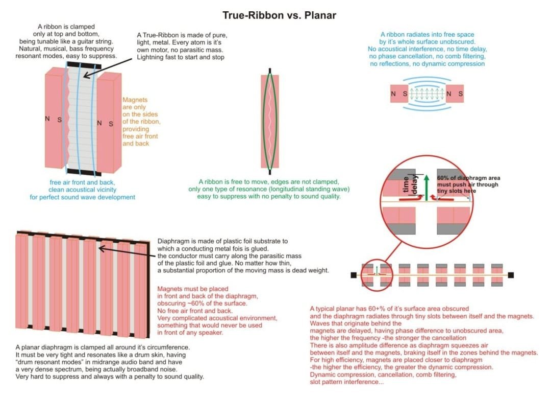 - Perinteinen dynaaminen kartioelementti on hidas, koska sen on raahattava mukanaan painavaa äänikelaa ja sen kiinnikkeitä. Lisäksi rakenne on aina takaa lähes suljettu suuren magneetin vuoksi. Fyysisten rajoitteidensa vuoksi tällainen elementti ei voi koskaan olla yhtä nopea ja avoin kuin nauhaelementti.