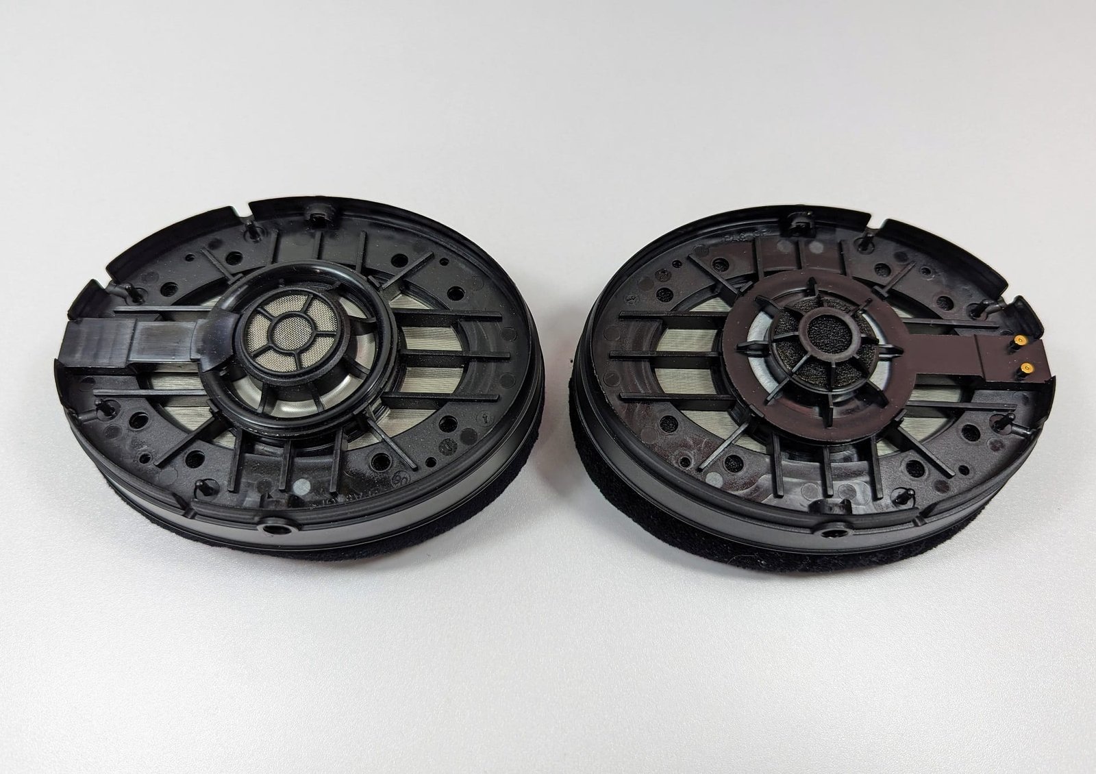 Vasemmalla HD 660S2:n elementin takapuoli ja oikealla rakenteeltaan yksinkertaisempi HD 600:n elementti. Kuppien perusrakenne on molemmissa kuulokkeissa sama.