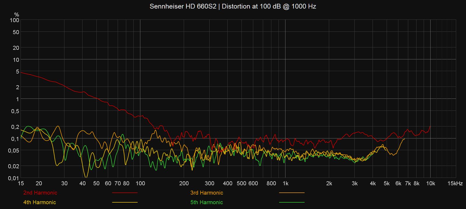Vaikka säröä onkin mittausteni perusteella edelleen alimmilla taajuuksilla runsaasti, tilanne vaikuttaa kohentuneen jonkin verran. Esimerkiksi 2nd Harmonic -säröä 50 hertsin taajuudella HD 660S2:ssa noin 1 prosentti, kun sitä on HD 600:ssa 2 prosenttia. Vastaavasti pienempi särön määrä 20–40 Hz:n välillä on tervetullut parannus ottaen huomioon, että HD 660S2:ssa alabasson määrä on samaan aikaan HD 600-mallia suurempi. Myös ylemmillä taajuuksilla on tapahtunut pientä parannusta, joka oli toistettavissa useilla peräkkäisillä mittauksilla. Tein mittaukset asettamalla äänenvoimakkuudeksi 100 desibeliä 1000 hertsin taajuudelle, joten hiljaisemmalla äänenvoimakkuudella säröä olisi vähemmän.