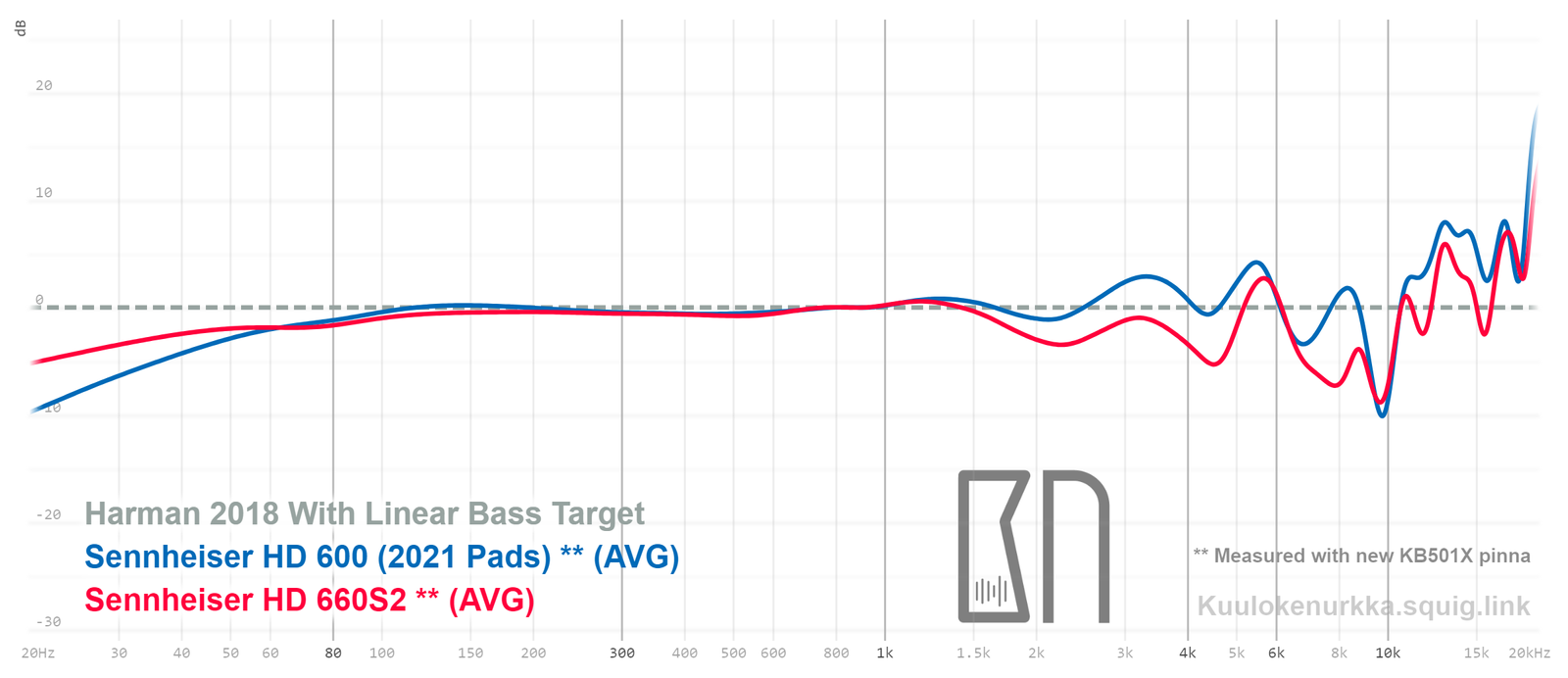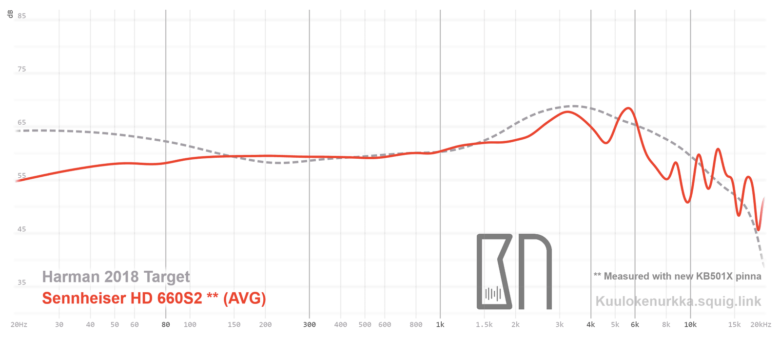 Sennheiser HD 660S2:n taajuusvaste suhteessa Harmanin tavoitekäyrään vuodelta 2018. Mittaukset on tehty IEC711-standardin mukaisella laitteistolla useiden mittauskertojen ja kahden kanavan keskiarvona.