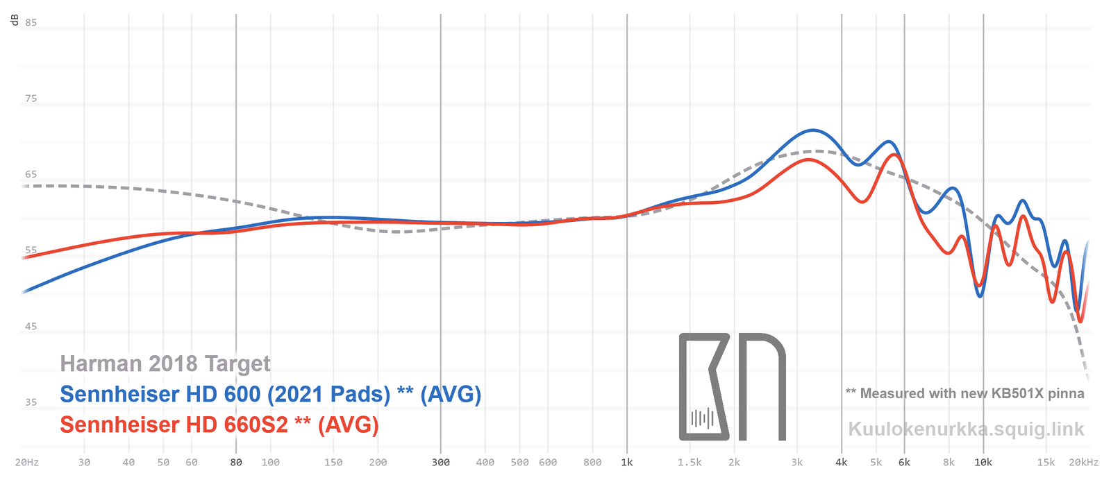 Kuulokkeiden taajuusvastemittaukset on tehty IEC711-standardin mukaisella laitteistolla ja uusilla tarkemmilla silikonikorvilla (KB501X). Kuvaajissa käytetään vertailupohjana tieteelliseen tutkimukseen pohjautuvaa Harmanin tavoitekäyrää (vuoden 2018 versio), joka on yleistys siitä, millaisen taajuusvasteen mukainen ääni kuulostaisi suurimman osan mielestä hyvältä. Lisätietoa mittauksista ja niiden tarkkuudesta löytyy Taajuusvastemittaukset-sivulta. HD 660S2:n taajuusvaste on myös vertailtavissa muiden mitattujen kuulokkeiden kanssa vertailutyökalun avulla.