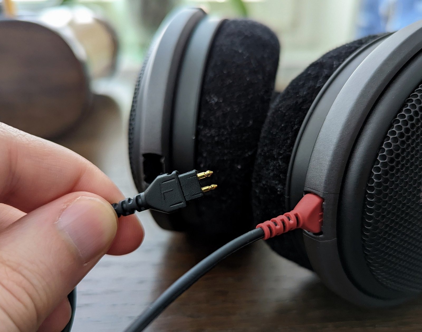 HD 600-sarjan kuulokkeissa on 2-pinninen liitin, jota ei tietoni mukaan käytetä vastaavasti johdotettuna minkään muun valmistajan kuulokkeissa – Fostex käyttää samaa liitintä pinnit päinvastoin käännettynä. Sennheiserin epätavallisen liitinvalinnan pelastaa se, että sitä on käytetty jo 30 vuotta. Erilaisia kaapeleita on hyvin tarjolla, mikäli valmistajan omat kaapelit eivät miellytä. Irrotettava kaapeli oli ylipäätään hieman harvinaisempi ominaisuus 1990-luvulla, joten otan sen ilolla vastaan.
